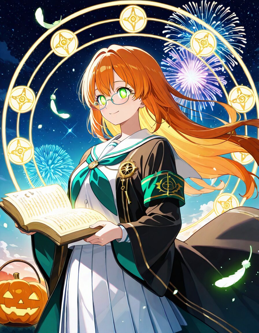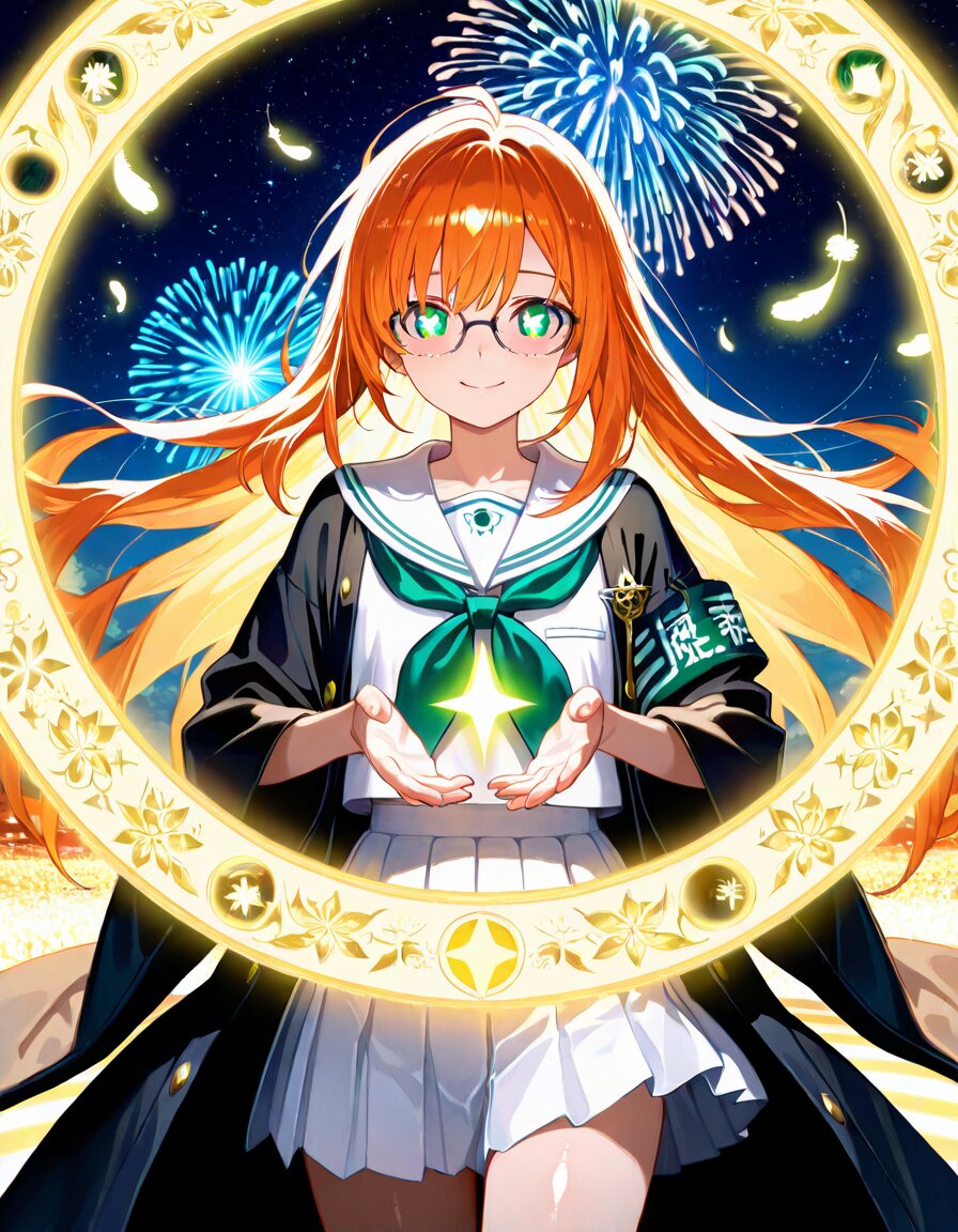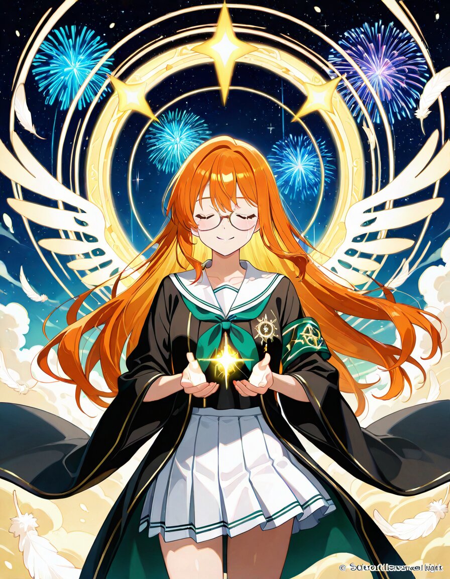 (masterpiece, best quality, ultra-detailed anime style),cinematic cowboy shot composition of a beautiful female student standing in the center of a radiant ascending vortex of white-gold light and glowing feathers beneath a vast starry night sky,the school festival executive committee president performing the final transcendent magic of the halloween night festival,tears of joy shimmering in her eyes as she smiles softly,elegant glasses with gentle reflections,wearing a deep green armband embroidered in gold reading “executive committee”,dressed in a pure white sailor uniform with a deep green neckerchief and a white pleated skirt with a single deep green line near the hem,layered with a flowing black robe lined with luminous golden embroidery,the robe dramatically fluttering in the glowing wind,semi-long copper-orange hair illuminated by divine white-gold light,floating concentric geometric magic circles made of light hovering around her body and feet,rotating slowly and emitting radiant energy,countless glowing feathers made of pure light spiraling upward,intertwining with the luminous rings to form a celestial vortex,radiant beams and soft volumetric glow,ethereal lighting,deep night sky with faint starlight and distant fireworks,serene yet powerful atmosphere,divine and emotional climax,anime key visual style,ultra-high quality,breathtaking and sacred composition,