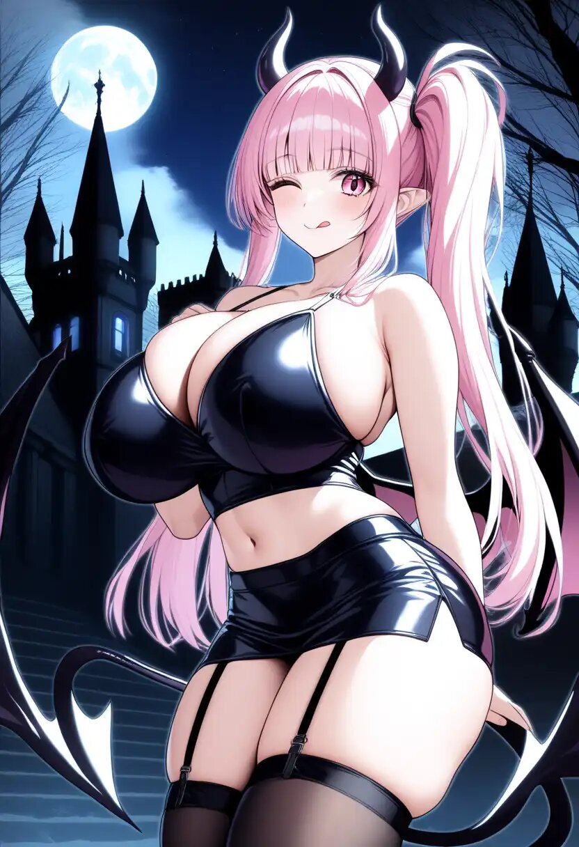 [demon girl]++, [demon horns]++, [demon tail]++, [demon wings]++, one eye closed, tongue out, smile, blush, closed mouth, [beautiful girl]++, [huge breasts]++, perky breasts, hanging breasts, curvy, cleavage, collarbone, sleeveless, bare shoulders, bare arms, midriff, miniskirt, garter straps, black thighhighs, skindentation, cowboy shot, [Beautiful skin]++, tall, [long hair]++, [straight hair]++, shiny, shiny skin, [big eyes]++, [shining eyes]++, [Beautiful legs]++, [beautiful face]++, legs together, [standing]++, night, lightning, outdoors, bare tree, castle, ghost, [high side ponytail]++,