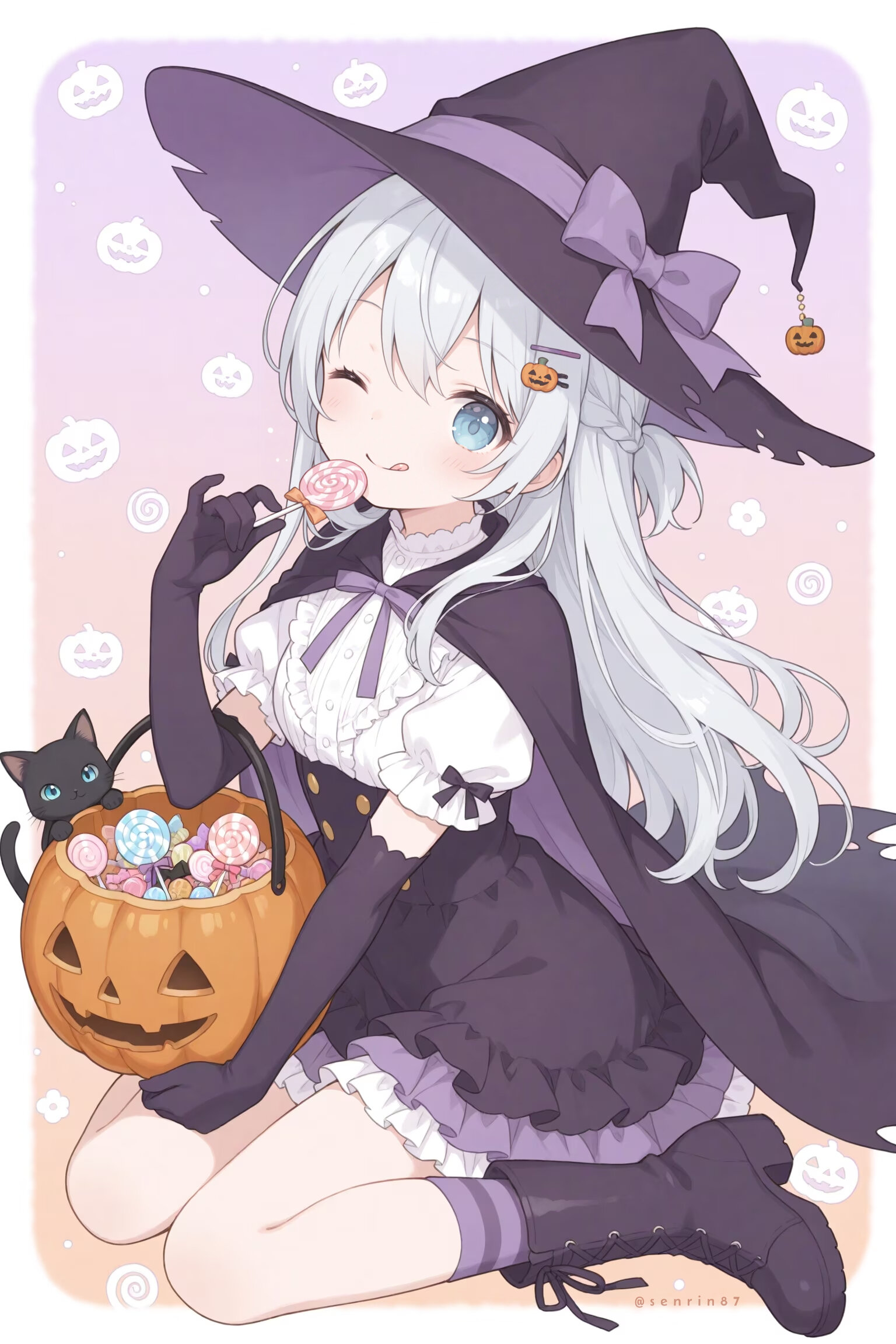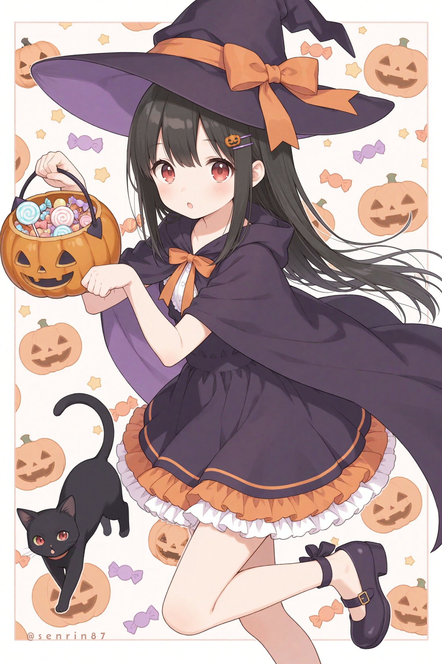 (flat color:0.2),(tareme:0.3), cute girl, red eyes, straight hair ,black hair ,(hair between eyes:0.5), hairpin, kawaii, (pastel theme :0.7), (depth of field:0.7), (bokeh:0.7), (from above:0.3), (from side:0.2),:o, black cat, ribbon, BREAK black cat,witch_hat,BREAK black cat in pumpkin, witch costume, holding halloween bucket,witch_hat, hands up, cape, pumpkin background, frilled skirt, refined dress, too many frills, (yume kawaii:0.5), candy,standing on one leg,paw_pose, shoes