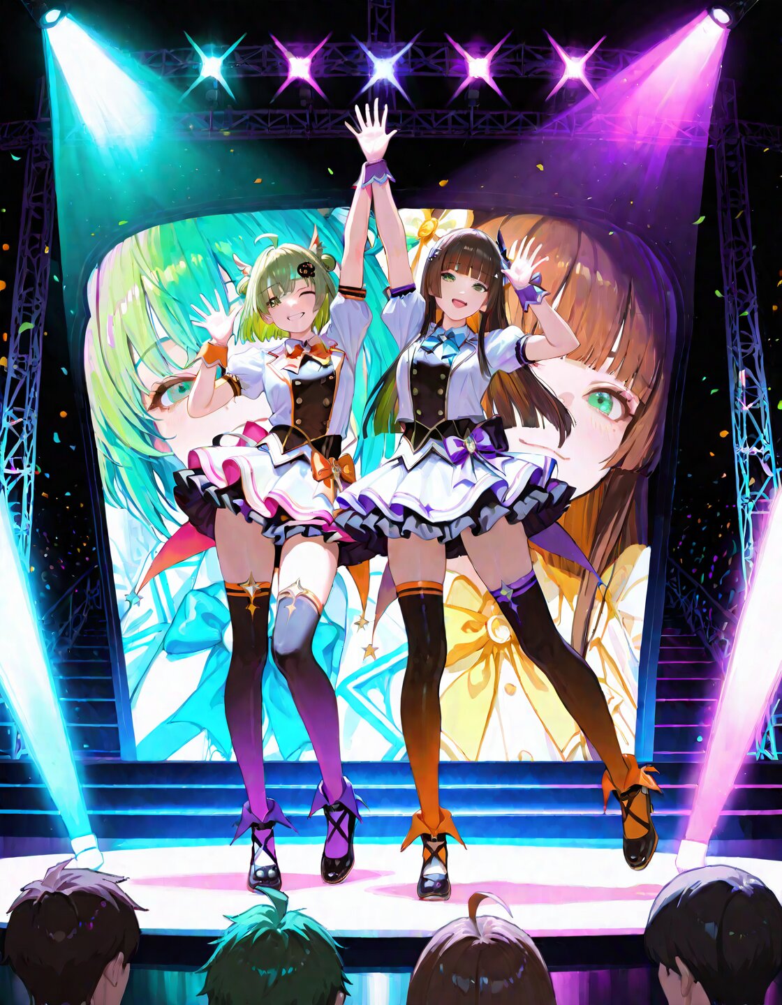 masterpiece,best quality,insanely detailed,beautiful, 16k,realistic illustration,on Stage,dream fulfillment,shining lights,on stage,kawaii,kawaiipunk,dreamy atmosphere,in a bright and colorful world,colorful lighting,stage lights,dynamic lighting,Halloween atmosphere,AND (2boys:1.1),ahoge,green hair,short hair,straight hair,hime cut,green eyes,blunt bangs,hair ornament, delicate face,detailed face,detailed skin,detailed clothes,masterpiece,best quality,insanely detailed,beautiful, 16k,realistic illustration,on Stage,dream fulfillment,shining lights,cheers,one eye closed,idol,dancing,cheerful,hopeful,cheerful grin,(waving at the viewer:1.2),thighhighs,mini skirt,on stage,kawaii,kawaiipunk,dreamy atmosphere,in a bright and colorful world,colorful lighting,stage lights,dynamic lighting,full body shot,Halloween atmosphere,AND (2boys:1.1),ahoge,brown hair,short hair,straight hair,hime cut,green eyes,blunt bangs,hair ornament, delicate face,detailed face,detailed skin,detailed clothes,masterpiece,best quality,insanely detailed,beautiful, 16k,realistic illustration,on Stage,dream fulfillment,shining lights,cheers,idol,dancing,cheerful,hopeful,cheerful smile,(fextending hands toward the viewer with fingers open:1.4),(standing on one leg:1.3),thighhighs,mini skirt,on stage,kawaii,kawaiipunk,dreamy atmosphere,in a bright and colorful world,colorful lighting,stage lights,dynamic lighting,full body shot,Halloween atmosphere