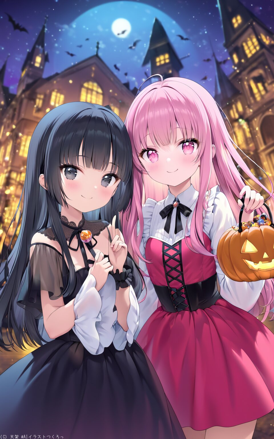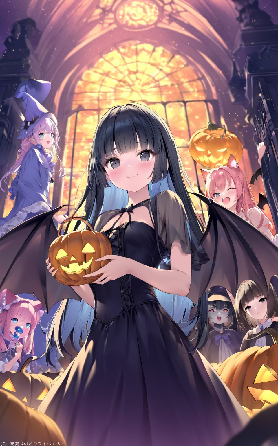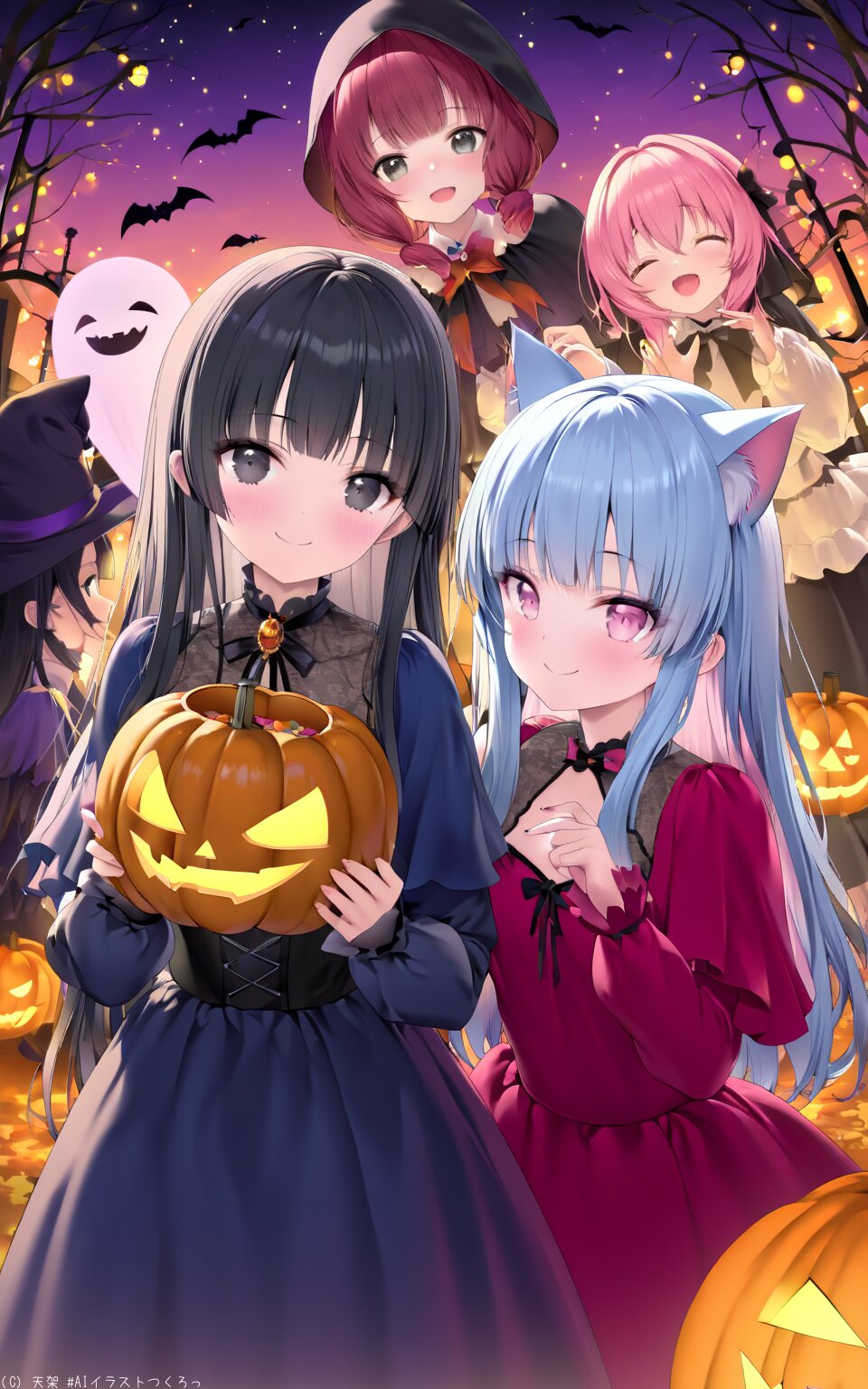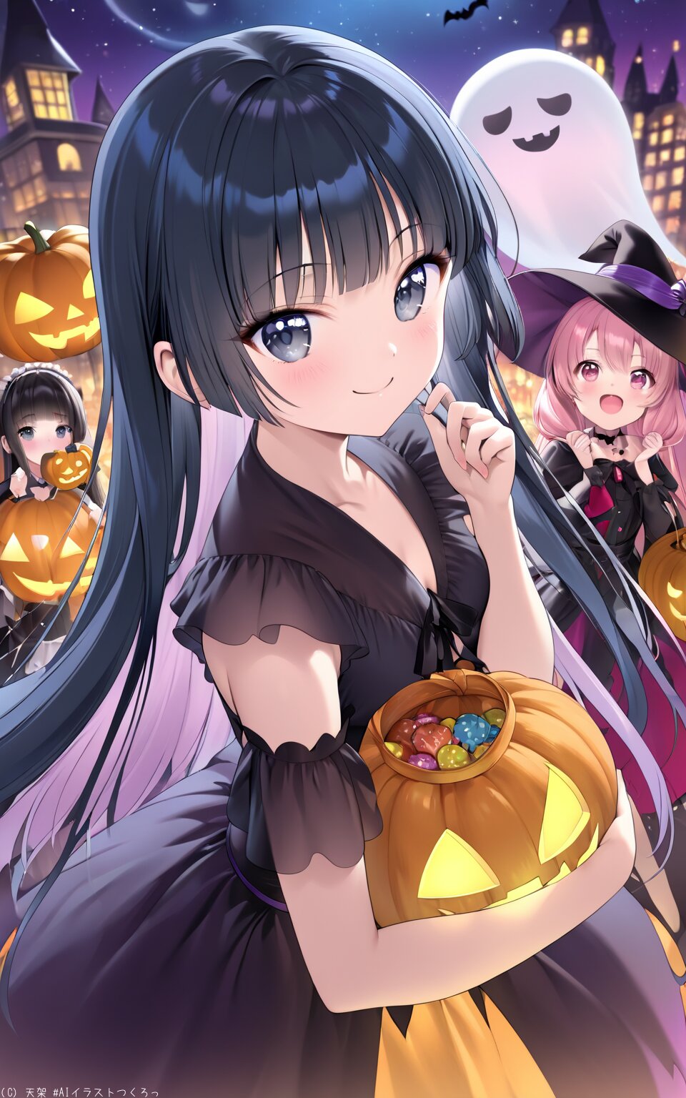 (best quality),(masterpiece),(ultra detailed),absurdres,hires,ultra detailed, high resolution hires, best quality, master piece, Cute Girl, 16years old, Smile, black hair, hime cut, long straight hair, black eyes, Slim body, magical illustration A Halloween party scene featuring adorable girls in costumes a black-haired vampire bat wings, a blue-haired witch, a brown-haired zombie, a pink-haired cat girl, and a red-haired ghost. They are holding Jack-o'-lantern baskets and distributing candies. The illustration should be lively, colorful, and charming, capturing the festive and playful atmosphere of the event