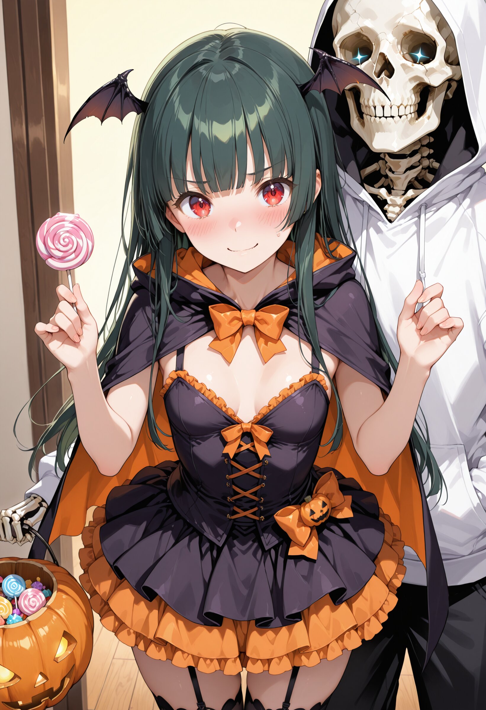 (masterpiece, best quality, ultra-detailed, dynamic pose, expressive emotion), couple, 1girl, 1boy, halloween costumes, female: dark green hair, long hair, hime cut, red eyes, small breasts, embarrassed expression, blushing, short Cape, cute bat-themed halloween outfit, frilly skirt, holding candy, male: wearing skeleton hoodie, grinning playfully, teasing pose, pumpkins, candy scattered around, fun and playful halloween scene, warm lighting