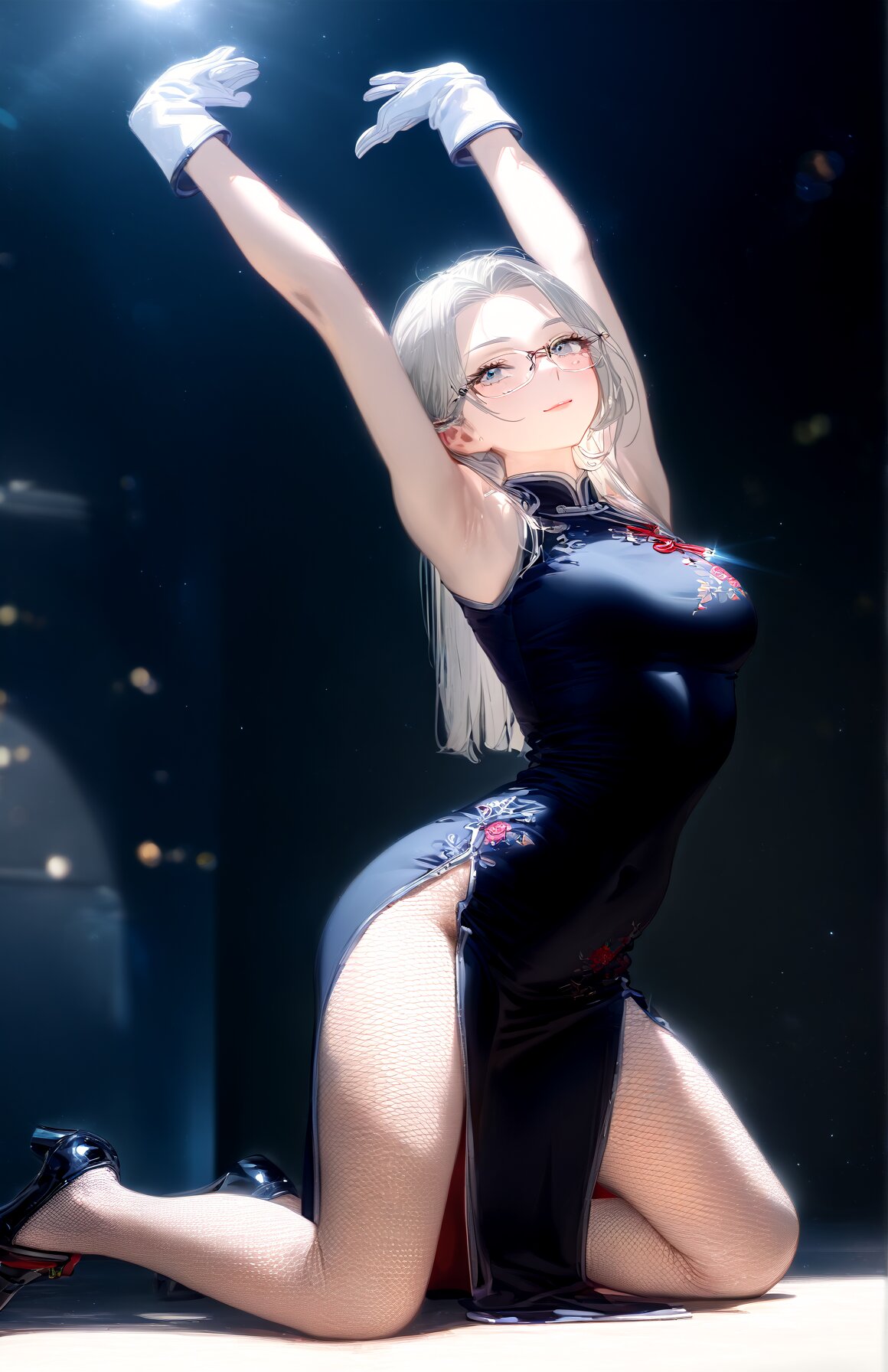 1girl, cammy white, (delicate facial features:1.1), (ultra high res:1.1), (extremely detailed eyes and face:1.1), (perfect anatomy:1.2:1.1), (super detailed skin:1.1), (cinematic lighting:1.1), (cinematic shadow:1.1), (photorealistic:1.1), cowboy shot, kneeling, (arms up:1.2100000000000002), catch the above, white high slit chinese dress, epaulet, rank insignia, abbreviation, lapel pin, epaulettes, military ribbon, white short gloves, military white hat, military uniform, detailed, (very long white:1.2100000000000002), straight hair, light gray eyes, mole, mole under eye, white background, light smile, heavy makeup, short sleeves, botanical embroidery fishnet tights, bokeh, slender, ge1sp0r, solo, sirmont16A, glasses, arched back, archedbacksideview, arching back, back lifted, full body cammy stretch \(meme\), stretching, cammystretch, full body, armpits <lora:Genki Dama:0.88> <lora:glasses_sirmont1_SDXL_V1:0.65> <lora:ArchedBackSide3:0.63> <lora:cammy_stretch_(meme):0.71> <lora:pose_cammystretch_ponyXL:0.69>
