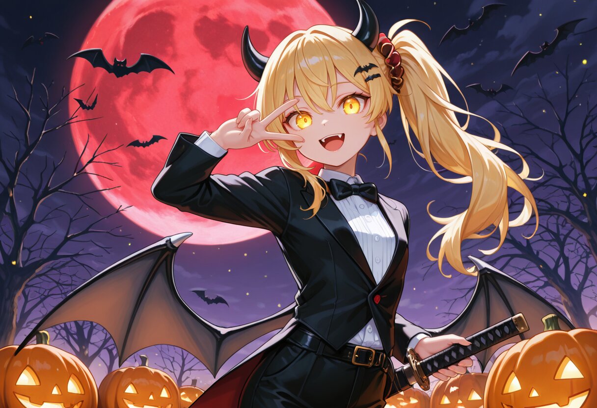 masterpiece,best quality,highres,ultra detailed,highly detailed,detailed eyes,perfect anatomy,general,1girl,solo,17yo,cute,(cute bat smiling,vampire,fang,bat wings,v over eye),two demon horns,black horns,demon girl,small breasts,long sleeves,blonde hair,long hair,side ponytail,hair scrunchie,hairclip,yellow eyes,glowing eyes,smile,open mouth,(halloween costume,long black tuxedo,black bowtie,black pants),manicure,slender girl,holding katana over hand,sheath belt,sheathed,Halloween,night,red fullmoon,upper body,fantasy,jack-o'-lantern,