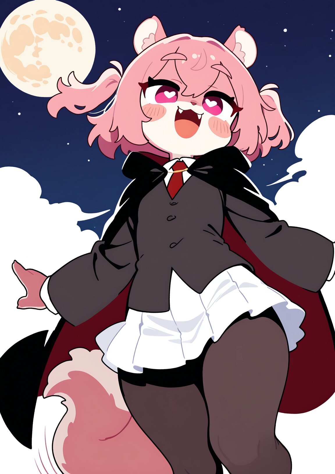 1girl, solo, short female, loli, rodent, (squirrel girl), (furry female), pink squirrel ears, pink squirrel tail, (flat breasts), slim, wide hips, thick thighs, pink hair, short hair, two side up, pink eyebrows, hair between eyes, tsurime, pink eyes, round eyes, heart-shaped pupils, heart in eye, blush stickers, smile, open mouth, buck teeth, fangs, black cloak, red colored inner cloak, red necktie, black T-shirt, long sleeves, white miniskirt, black pantyhose under miniskirt, motion lines, motion blur, motion trail, afterimage, smear frame, floating hair, speed lines, full moon background, night, cloud, starry sky, looking ahead, from front, three quarter view, perspective, smooth, cinematic angle, (high contrast:1.2), (stylized), (kawaii), (cute), ((detailed_anatomy)), gddw, (detailed_hands:1.5), flat color style, simple coloring style, black pantyhose, flat color, no lineart, lolitaaa, girl, small body, short girl, petite, very short, tiny, cute, solo, gddw, (detailed_hands:1.5), flat color style, simple coloring style, black pantyhose, flat color, no lineart, lolitaaa, girl, small body, short girl, petite, very short, tiny, cute
