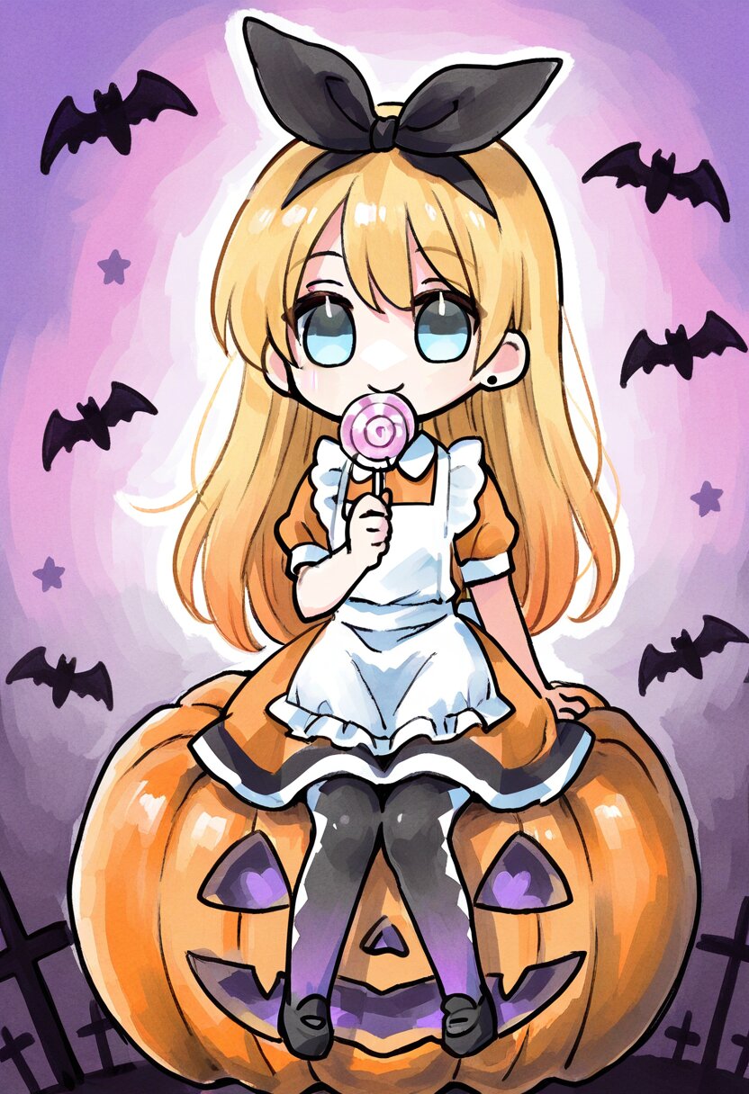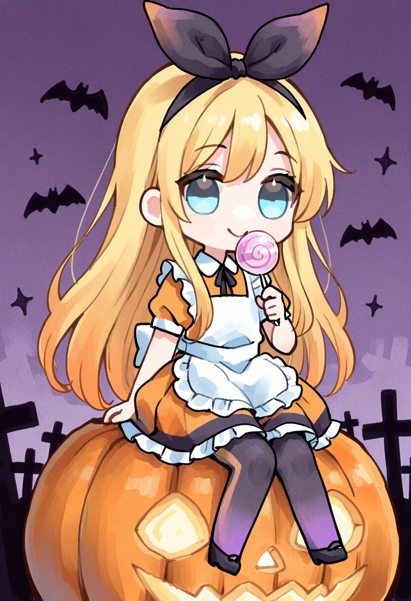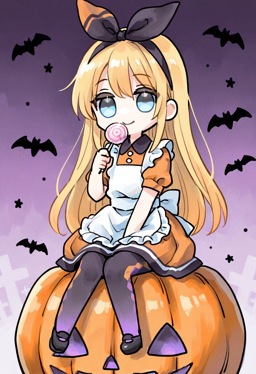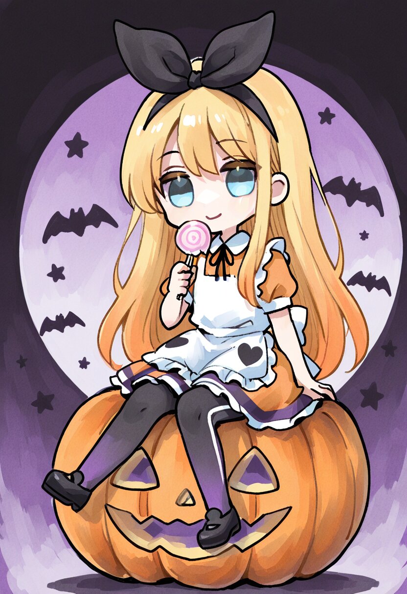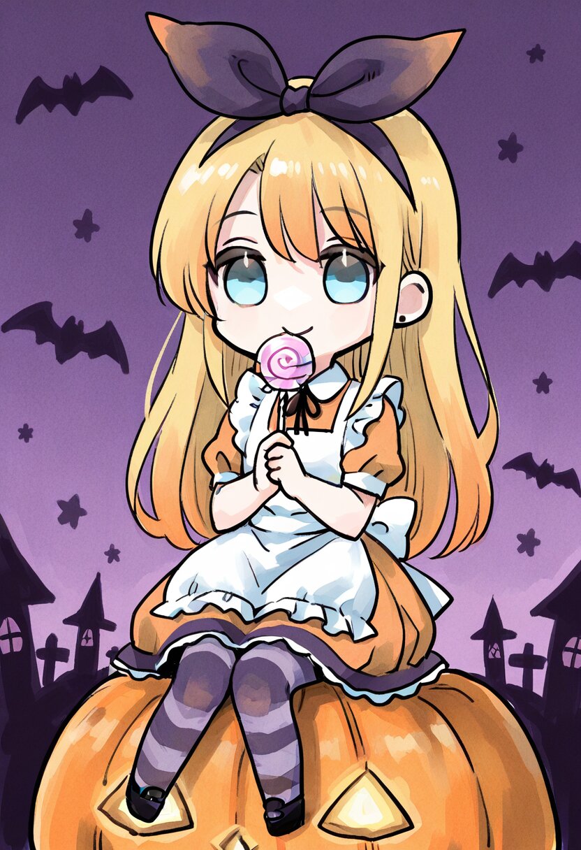 <lora:inmnstylilxl:0.9>, best quality, masterpiece, very aesthetic, general, watercolor painting, 1girl, chibi, solo, alice in wonderland, orange dress, white apron, large orange hair ribbon, black and white horizontal stripe tights, sitting on large pumpkin, flying bats, purple halloween background, blonde hair, long hair, light blue eyes, smile, holding lollipop