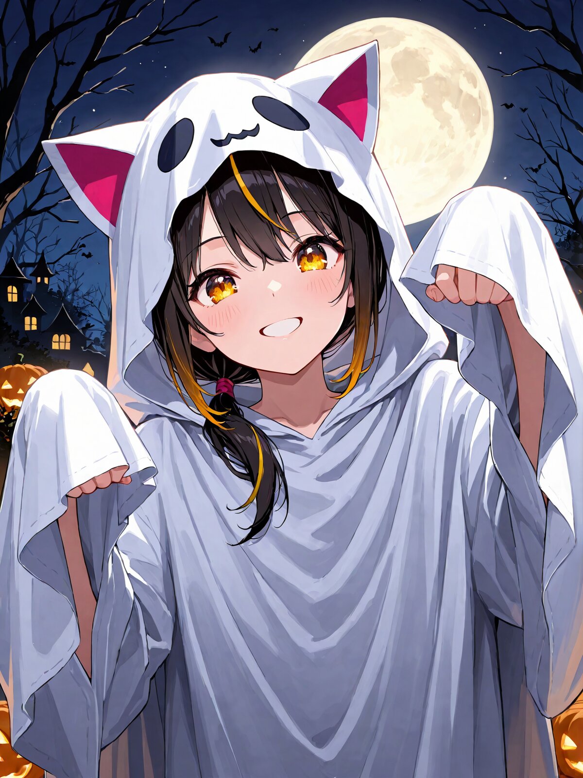 ghost costume, Halloween, night, moon, ghost pose, grin, smile, solo, gold amber eyes, low ponytail, black hair, cat ears,