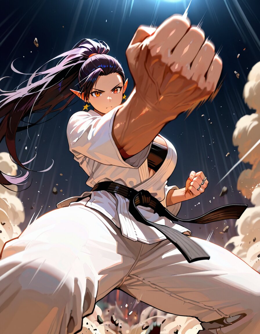 Elf,voluptuous body,ponytail,hair pulled back black hair,long hair,sharp bangs,dark skin,orange eyes,(huge breasts:0.4),muscular,toned body,athletic build,star earrings,ring earrings,(wearing a white karate gi with a black belt and a black inner shirt underneath:1.2),(performing a powerful rising uppercut punch like a shoryuken:1.4),captured mid-air,intense battle motion,strong motion blur,dynamic action lines,speed lines,dust and debris flying,cinematic lighting,dramatic low angle,sense of impact and velocity,background motion blur,ultra-detailed,fantasy action scene,masterpiece,, (best quality,masterpiece:1.4),(high resolution,super fine illustration:1.36),shiny skin,finely,detailed face,japaneese idol