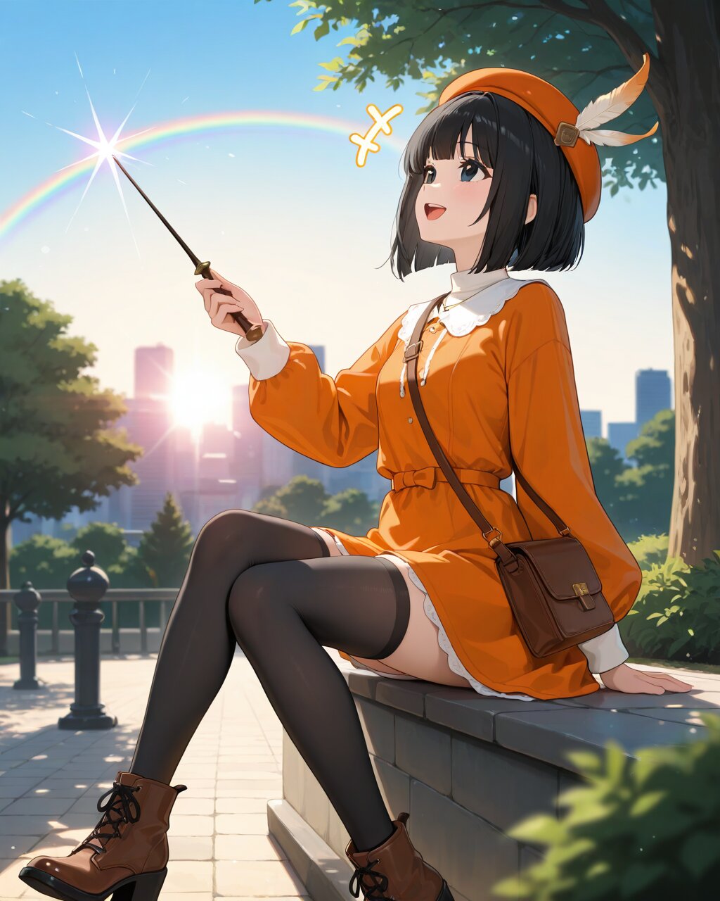 masterpiece, best quality, amazing quality, 4k, very aesthetic, high resolution, ultra-detailed, absurdres, newest, scenery, 1girl, black straight bob cut, black eyes, long-sleeved orange dress, ankle boots, socks, black thighhighs, orange beret, hat feather, shoulder bag. BREAK close-up, happy, looking up, holding wand, casting spell, rainbow, clear sky, sunrise, lens flare, sparkling aura, +++, cityscape, park, tree, BREAK depth of field, volumetric lighting