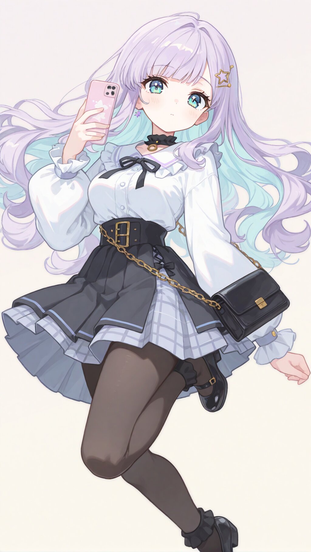 black tights, masterpiece、best quality、amazing quality, solo, kawaii, cute, dynamic pose, dynamic angle, looking at viewer, soft anime face, teenage, pastel purple hair, (light blue inner hair:1.3), fluffy long hair, loosely wavy hair, soft flowing hair, straight-cut bangs, star-shaped hairpin, calm violet eyes, medium breasts,, (soft pastel color palette:1.5), (pale colors:1.3), watercolor texture, matte finish, subtle shading, minimal contrast,, wearing a classic girly outfit, long sleeve white blouse with frilled collar and ribbon tie, puffed sleeves with frilled cuffs, high-waisted plaid pleated skirt in gray tones with decorative chain and ribbon, black waist corset-style belt, black shoulder bag with flap, ankle socks with frills, black mary jane shoes, cute and elegant, retro-classic style, ((Holding the smartphone with both hands and looking at it)),
