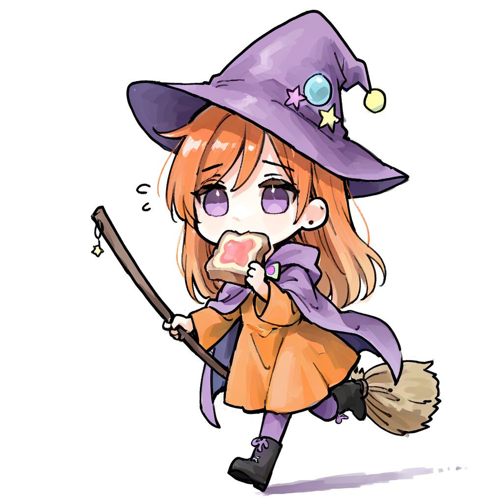 <lora:inmnstyleilxl:0.9>,, best quality, masterpiece, very aesthetic, watercolor painting, general, chibi, solo, 1girl, hold toast between her mouth, holding broom, running, sweatdrops, flying sweatdrops, orange hair, purple eyes, purple witch hat, purple witch cape, orange dress, purple tights, black boots, white background, funny
