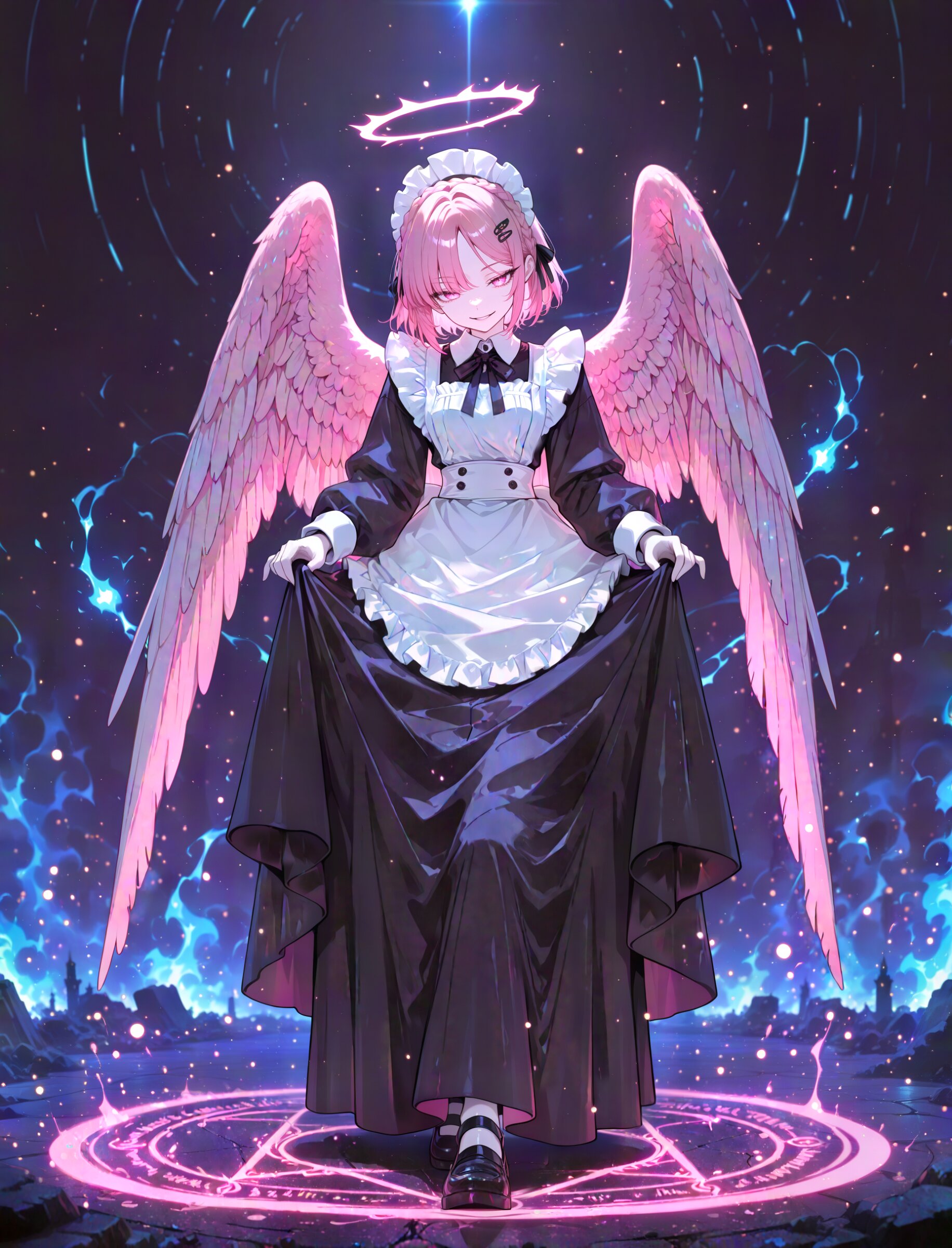 aerial view, looking down (absurdres absolutely resolution:1.2),texture, official art, ultra detailed, unity 8k wallpaper, dark theme, (simple celadon background:1.2), drop shadow, colored shadow, 1girl, (ultra-detailed), solo, maid, pale skin, short hair, crown braid,parted bangs hairclip , oily hair, pale celadon hair, (beautiful slit pupils, naughty face:1.0), long sleeves classic maid uniform, long skirt, maid headdress, maid apron, luminous effect lens flare lotion shiny-glistening cute girl solo full body, standing, crossed legs, skirt lift, graceful courtesy, bowing (feathered wings, glowing halo:1.1), pale skin, (ultra detailed floating glowing magic circle:1.2), (high saturation) depth of field, bokeh, pink theme, super fine concept art, hard surface, graceful eyes, masterpiece, best quality, amazing quality, very aesthetic, absurdres, newest, professional art lots of details, , overexposure, sumie effect style, 4ur4_illu,shiny, glowing, glowing particles, glowing light particles, light particles, storm wind whirlwind, <lora:noline (1):-0.5> <lora:sdxl2-flat2-512b:0.15> <lora:facelightup_xl_v10:0.5> <lora:V2_yakumo_alchemy:0.5> <lora:Aura_illu:0.1>