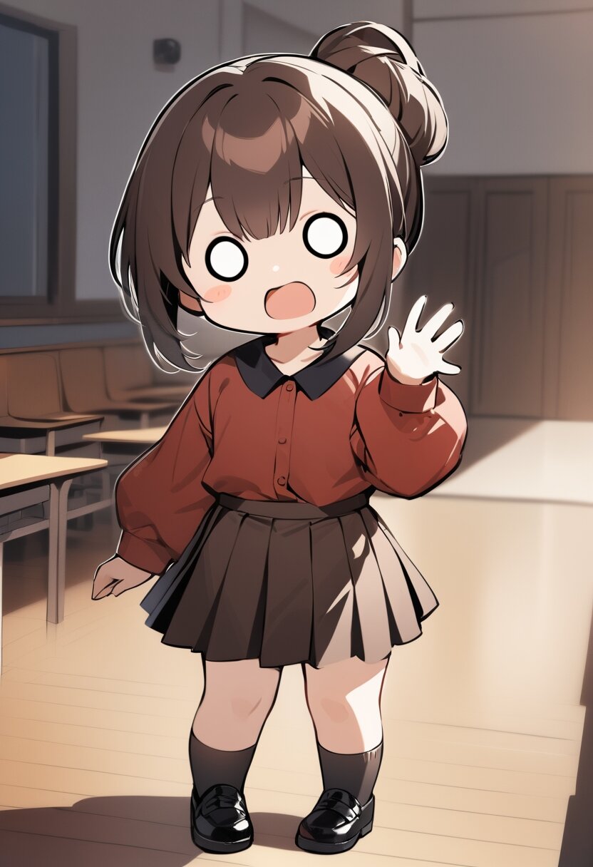 1girl, solo, (chibi), looking at viewers, hair bun, sidelocks, brown hair, single hair bun, puffy long sleeves, red shirt, dark brown long pleated skirt, black footwear, dark brown socks, ((o_o)), open mouth, blush stickers, indoors, lecture hall, hand up, full body, ((sweatdrops)),