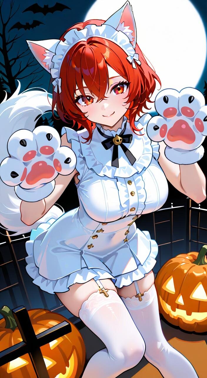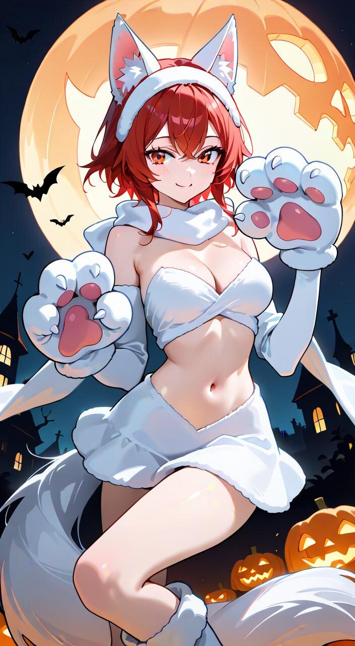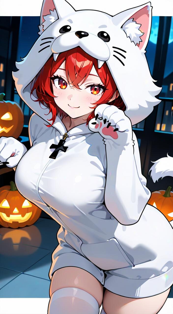 街の灯りがオレンジに染まる中、霧島紅葉は白いオオカミのコスプレで現れた。