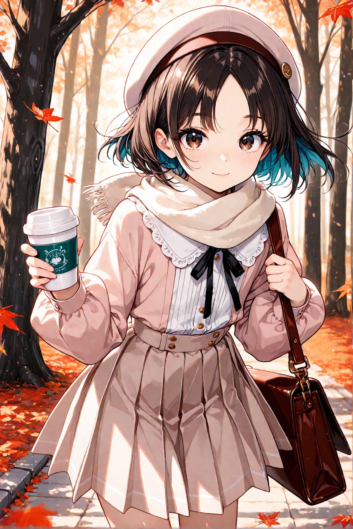 one hand holding a cup, soft smile, long-sleeved blouse, pleated midi skirt, wool fabric, soft cotton, scarf, beret, shoulder bag,