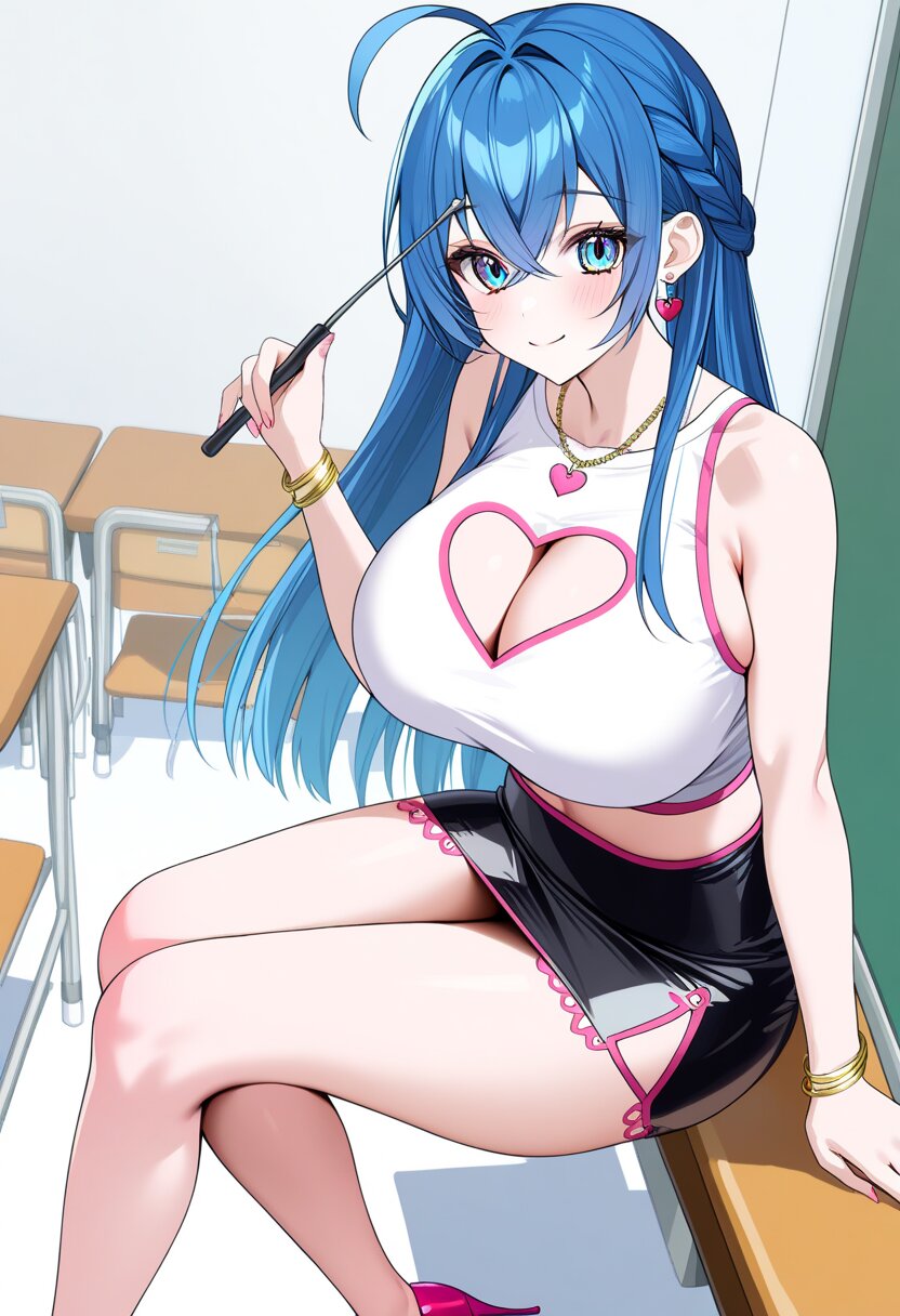[yokozuwari on desk]++, [sitting with legs to the side]++, [side sitting pose]++, [thighs touching]++, [legs together]++, [a large heart cutout is edged in pink]++, [cleavage]++, [beautiful girl]++, [huge breasts]++, perky breasts, hanging breasts, curvy, [white top]++, heart necklace, heart earrings, [holding pointer]++, sleeveless, bare shoulders, bare arms, gold bracelet, midriff, black pencil skirt, bare legs, [pink high heels]++, [full body]++, [Beautiful skin]++, tall, [long hair]++, [straight hair]++, shiny, shiny skin, [big eyes]++, [shining eyes]++, [Beautiful legs]++, [beautiful face]++, smile, blush, closed mouth, classroom, [points at the chalkboard], school chair, indoors,
