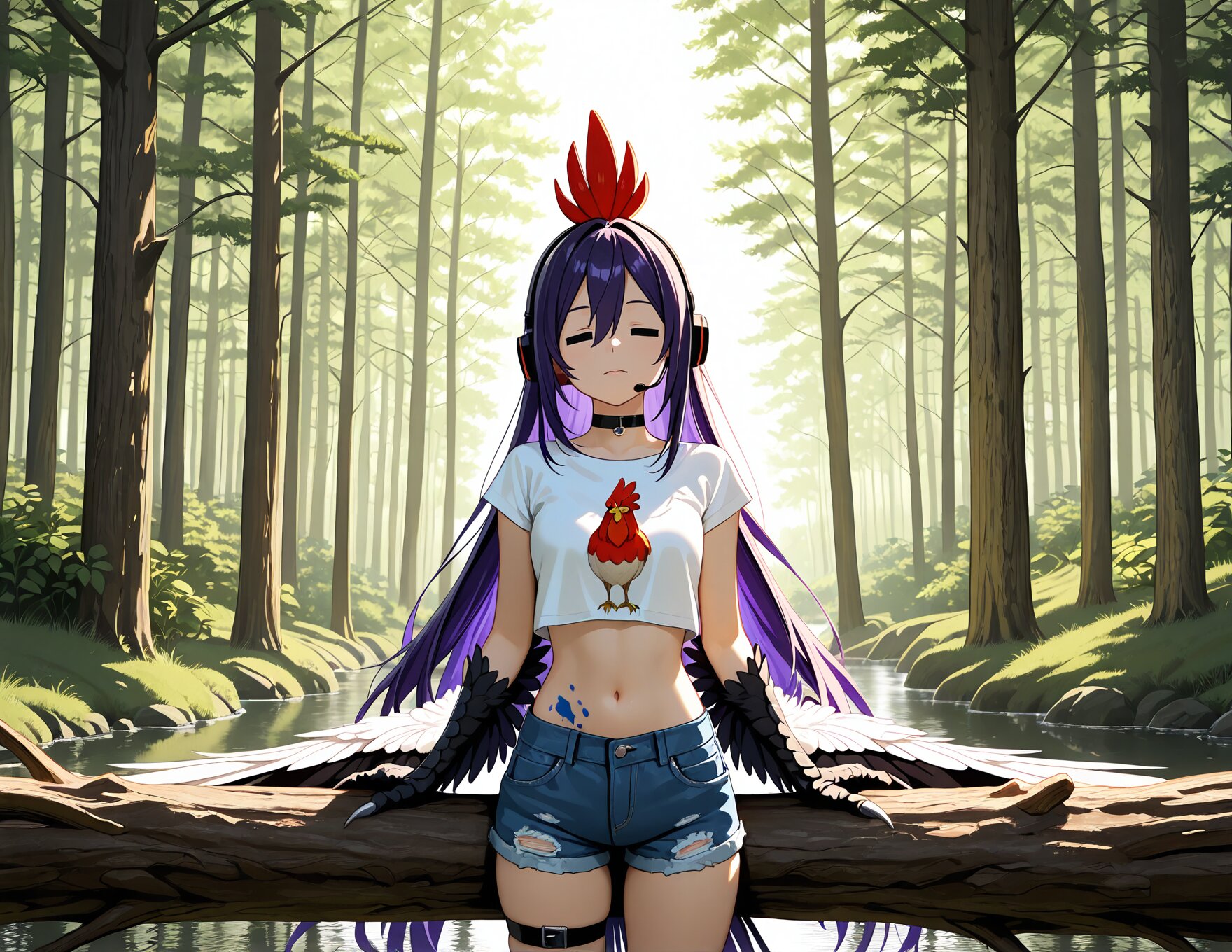 avian humanoid (rooster × harpy), human face, small comb, minimal wattles, large wings, layered tail feathers, bird claws, scaled legs, deep indigo hair, silver eyes // 酉, cowboy shot, wide shot, crop top, denim shorts, choker, graffiti, paint splatter, thigh strap, paint on body, multicolored hair, headset, (=_=:1.4), Balancing on a fallen log over a stream, forest buzzing with life, shafts of sunlight, noon.,
