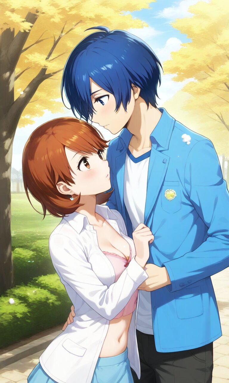 Couple, boy and girl, two people only,absurdres, ultra-detailed, master piece, high resolution, 8k, Boy, girl, couple, masterpiece, best quality, extremely detailed, silhouette of couple embracing under blooming cherry tree, snow still falling but melting on contact, transition from winter to spring, warm golden sunlight breaking through clouds, perfect anatomy BREAK the boy(yuuki makoto, blue hair, gray eyes, 1 boy , ) BREAK the girl(yukari takeba, short hair, light brown hair, brown eyes, large breaths,)