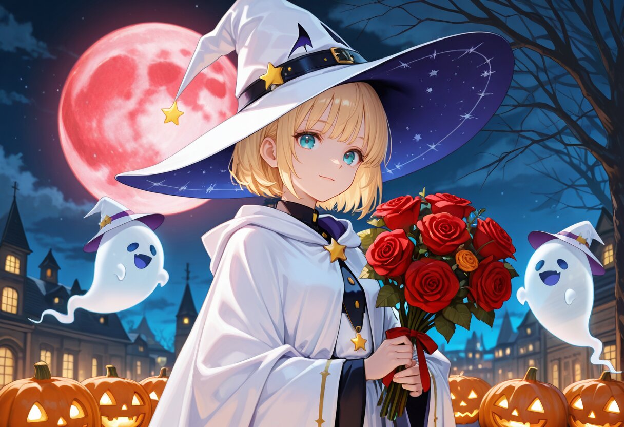 masterpiece,best quality,highres,ultra detailed,highly detailed,8k,general,(huge cute ghost,looking at viewer),Halloween theme,darkness,midnight atmosphere,moonlight shining,misty background,eerie atmosphere BREAK 1girl,solo,17yo,(long sleeves,wide sleeves,star pendant,blonde hair, short hair,bangs, blue eyes,holding huge rose bouquet with both hands),cute girl,slender,small breasts,light smile,closed mouth,priestess,(white clothes,white witch hat,long witch robe,long witch cape,white cape,long witch cloak,white cloak),slender girl,Halloween,night,upper body,fantasy,jack-o'-lantern,in town,red full moon,