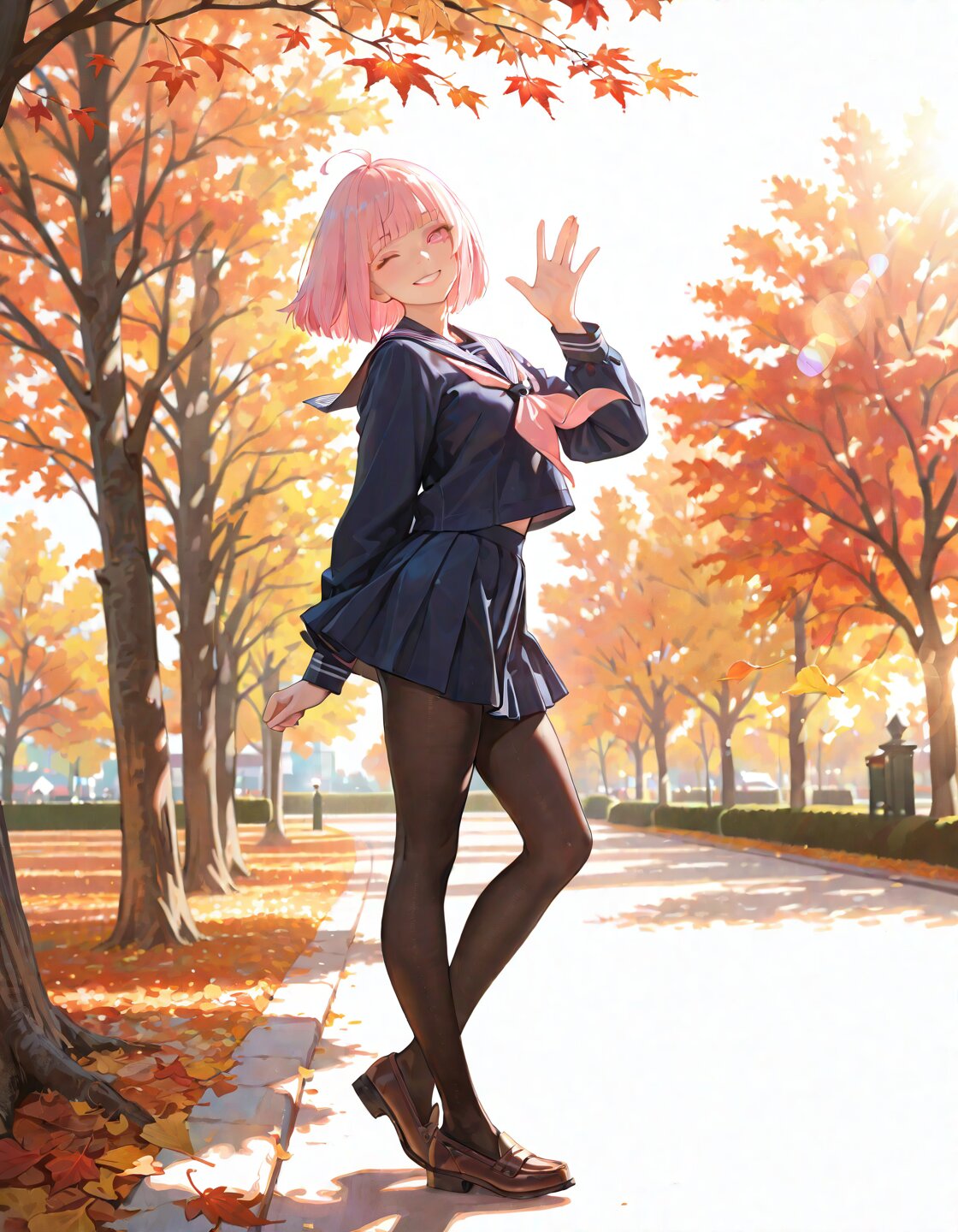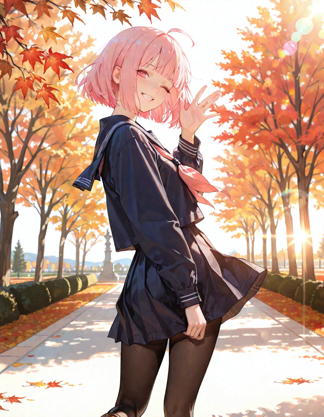 solo,1girl,ahoge,pink eyes,pink hair,hime cut,blunt bangs,straight hair,short hair, delicate face,detailed face,cute face,detailed skin,masterpiece,best quality,insanely detailed,beautiful, 16k,realistic illustration,happy,cheerful,grin,one eye closed,contrapposto, waving at the camera, looking at viewer,wearing navy serafuku,mini skirt,black tights,brown loafers,portrait,in the park, in the afternoon, calm atmosphere, vibrant academia,autumn,windy,side view, lens flare, sunlight, bloom, soft lighting, in focus with blurred background