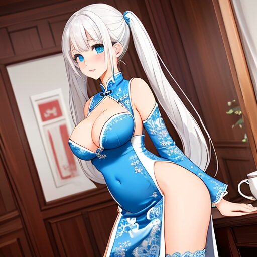 White hair, long twintails with sidelocks, topknot, aquablue eyes, standing from side large breasts china dress vaginal,sex nsfw