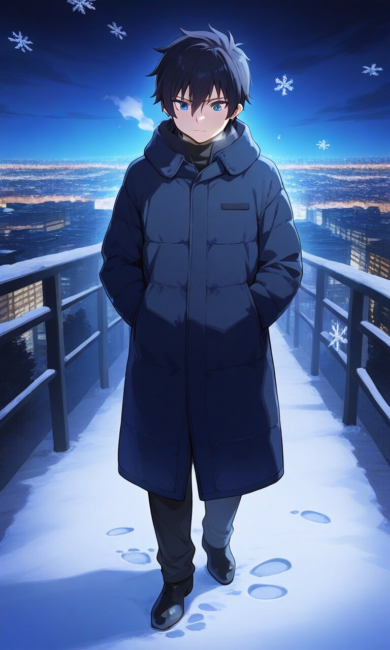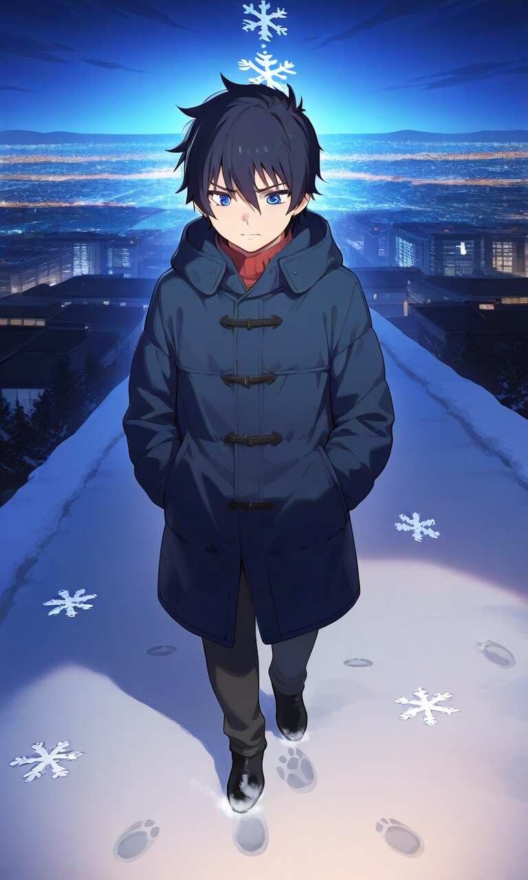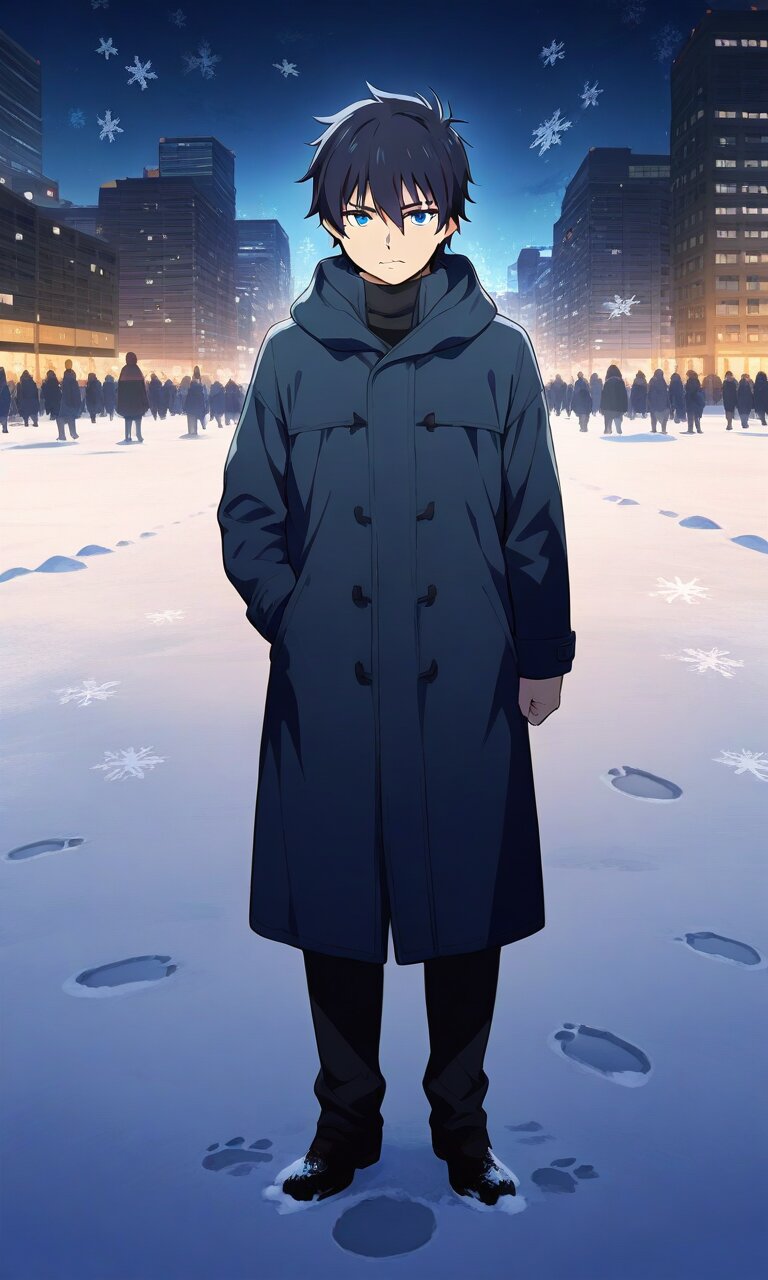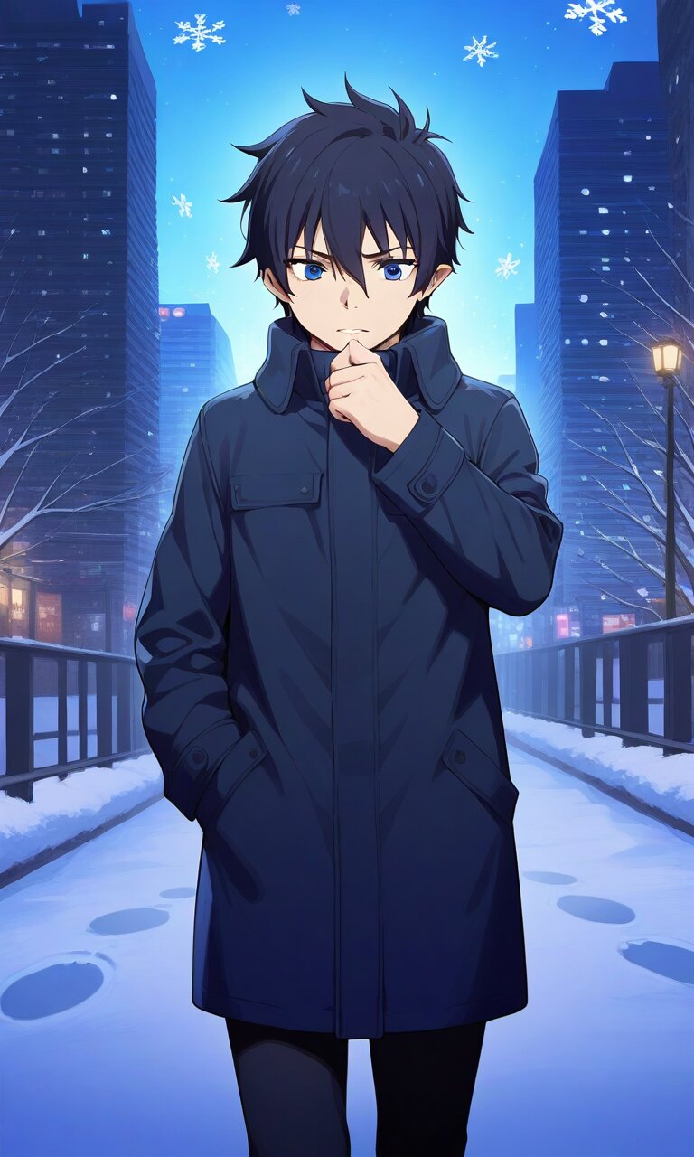 Rin Okumura, black hair, blue eyes masterpiece, best quality, extremely detailed, lone man in black coat, remorseful expression, standing in heavy falling snow at night, blurred city lights in background, snowflakes covering footprints, cold blue moonlight, perfect anatomy