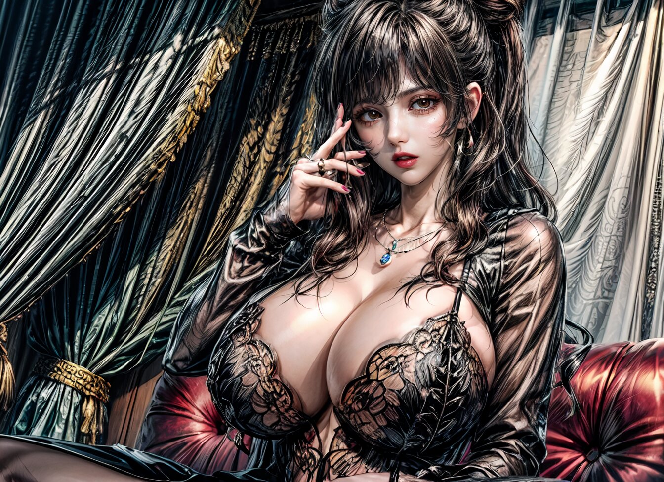 nsfw, (nude: 1.2), (8k, best quality, masterpiece:1.4), random pose, (from front: 1.6), 1woman, 42 years old, widow, hair bun, black hair, (glamor, huge breasts, beautiful nipple: 1.6), long hair, (elegant long sleeve draped dress, necklace and earrings: 1.8), looking at viewer, upper body, (yokozuwari on futon: 1.4), in the dark japanese house, dark night, <lora:flat2: -2> <lora:fujikoM_v01:1>