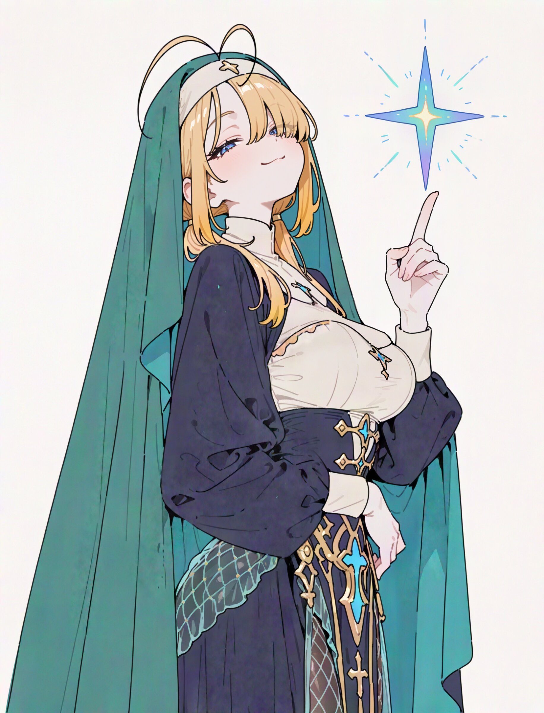 from side, looking at viewer (face:1.0) focus head , looking at viewer, (simple white background:1.1), drop shadow, colored shadow, 1girl, nun, beautiful detailed eyes, holy face, cool Elegant and sophisticated demeanor, (pale skin:1.0), skindentation, beautiful blue eyes, close eyes , two-tone hair, turquoise green and buttercup yellow hair, shoulder length hair, split ponytail hair over one eye antenna hair , first-rate female bodies perfect body beautiful very long breasts wide hips, , solo, nun, Good texture Mystical Veil, moss green plain cape, , majestic Pulpit gown, , the feel of silky, , , , , , long skirt, (silk overskirt:1.0), fishnet pantyhose, , shiny smile, (smirk:1.0), index finger raised super fine concept art, hard surface, graceful eyes, masterpiece, best quality, amazing quality, very aesthetic, absurdres, newest, professional art lots of details, , overexposure, shiny-glistening, (watercolor style:1.0), (pastel color style:0.5) <lora:noline (1):-0.5> <lora:sdxl2-flat2-512b:0.15> <lora:facelightup_xl_v10:0.5>