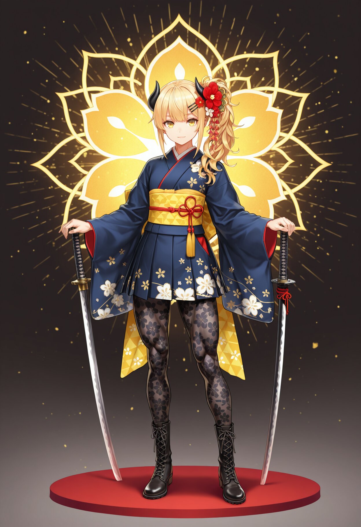 masterpiece,best quality,highres,ultra detailed,highly detailed,8k,general,modern,(muscular female, muscular,definied muscular legs,toned female, toned legs),1girl,solo,17yo,cute,(two demon horns,black horns,side ponytail,planted sword,planted sheath,hands on katana,sheathed),demon girl,small breasts,long sleeves,blonde hair,long hair,bangs,hairclip,yellow eyes,closed mouth,light smile,(modern kimono,flower patterned japanese clothes,cyber kimono,modern flower hair ornament,so many flower hair ornament,obi, flower patterned skirt,modern skirt, black pantyhose, flower patterned pantyhose),flower patterned boots,modern boots,slender girl,glowing flower patterned background,modern background,full body,fantasy,