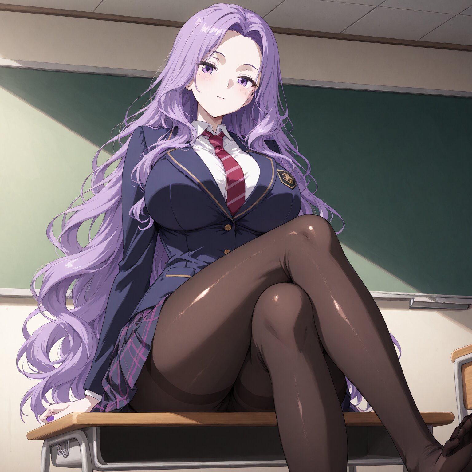 (1girl) BREAK ,((violet hair)), Mermaid hair, ((wavy hair)), ((abnormally long hair:1.2)), ((forehead)), parted bangs, ((mole under the right eye)), (very large breasts:1.2), ((heavy breasts:1.3)), (loose body), white skin, ((very shiny body)), (amethyst eyes) BREAK, Slender, narrow waist, toned body, athletic body, shiny skin, beautiful pupils, Clear eyes, beautiful eyes, purple nails School uniform, dress shirt, tie, blazer, jacket, pleated skirt ((tights, black tights)) School classroom, sitting at a desk, soles of legs, ((Cross your legs)) BREAK, ((newest, year 2024, anime, animation, anime screen capture, anime style:1.3)) BREAK, ((masterpiece, , vibrant, very aesthetic, highly detailed, best quality, 16k:1.3)) Perfect hands, perfect fingers,