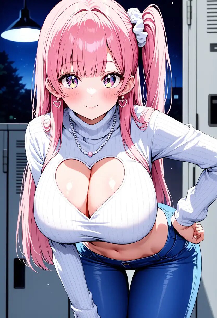 [a large heart cutout is edged in pink]++, [cleavage]++, [white turtleneck sweater]++, [locker room]++, [locker]++, [beautiful girl]++, [huge breasts]++, perky breasts, hanging breasts, curvy, heart necklace, pearl necklace, heart earrings, [frilled shoulders]++, long sleeves, midriff, [blue long denim]++, cowboy shot, [leaning forward]++, hand on own hip, legs together, standing, [Beautiful skin]++, tall, [long hair]++, [straight hair]++, shiny, shiny skin, shiny clothes, [big eyes]++, [shining eyes]++, [beautiful face]++, smile, blush, closed mouth, [hair scrunchie]++, [white scrunchie]++, indoors, night, window, night sky, [high side ponytail]++,