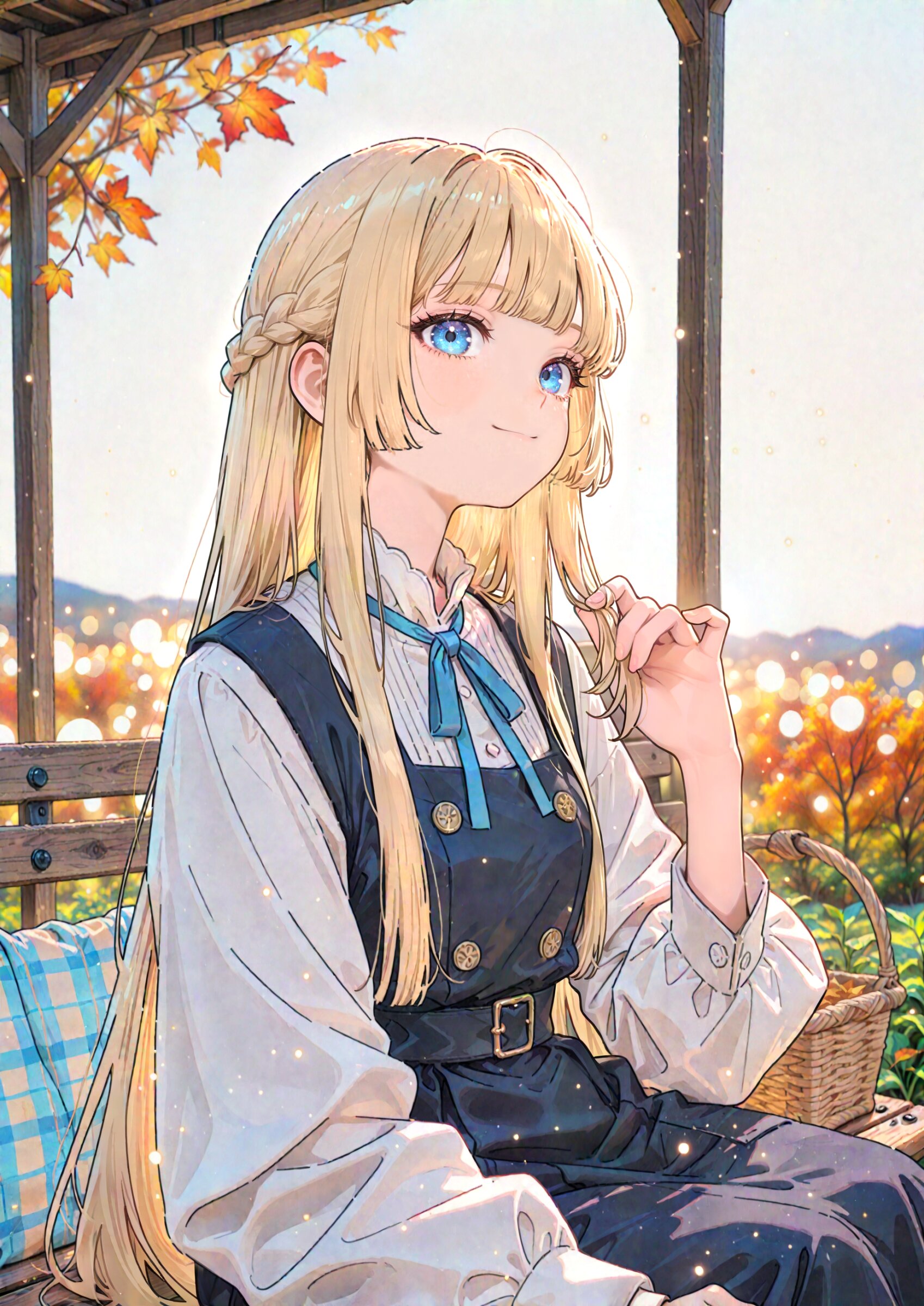 from front (portrait:1.0) (from above,looking up:1.0) looking at viewer (black Pinafore dress, blue neck ribbon, white blouse, 4gold buttons, 1girl (13yo:1.1), long sleeves very long hair, french braid, straight hair, hime cut, blond hair, blue eyes, closed mouth smile, Confident smile, playing with own hair:1.0), White walls, wooden bench, basket storage, simple coat hanger, check mat, , depth of field, bokeh, autumn, sidelighting, afternoon, super fine concept art, hard surface, 8K, unreal engine, masterpiece, best quality, amazing quality, very aesthetic, absurdres, you can add scenery, (volumetric lighting), To make the background more distinctive. professional art lots of details, , overexposure, shiny-glistening, (watercolor style:1.0), (pastel color style:0.0) 4ur4_illu,shiny, glowing, glowing particles, glowing light particles, light particles, cyan light particles , <lora:noline (1):-0.5> <lora:sdxl2-flat2-512b:-0.5> <lora:facelightup_xl_v10:0.5> <lora:V2_yakumo_alchemy:0.2> <lora:Aura_illu:0.1>
