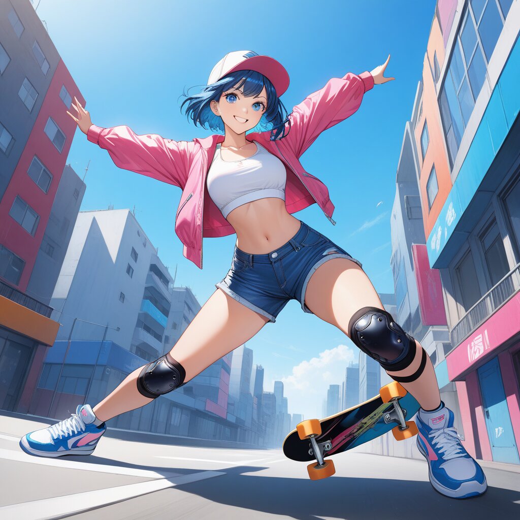 masterpiece, best quality, highres, absurdres, ultra-detailed, sharp focus, glossy, vibrant colors, anime style, 1girl, short blue hair, blue eyes, smiling, white crop top, pink jacket, denim shorts, baseball cap, knee pads, sneakers, holding skateboard, dynamic pose, low angle, clear sky, outdoor urban background