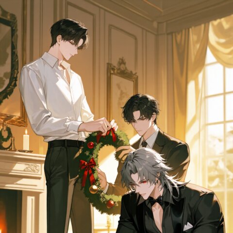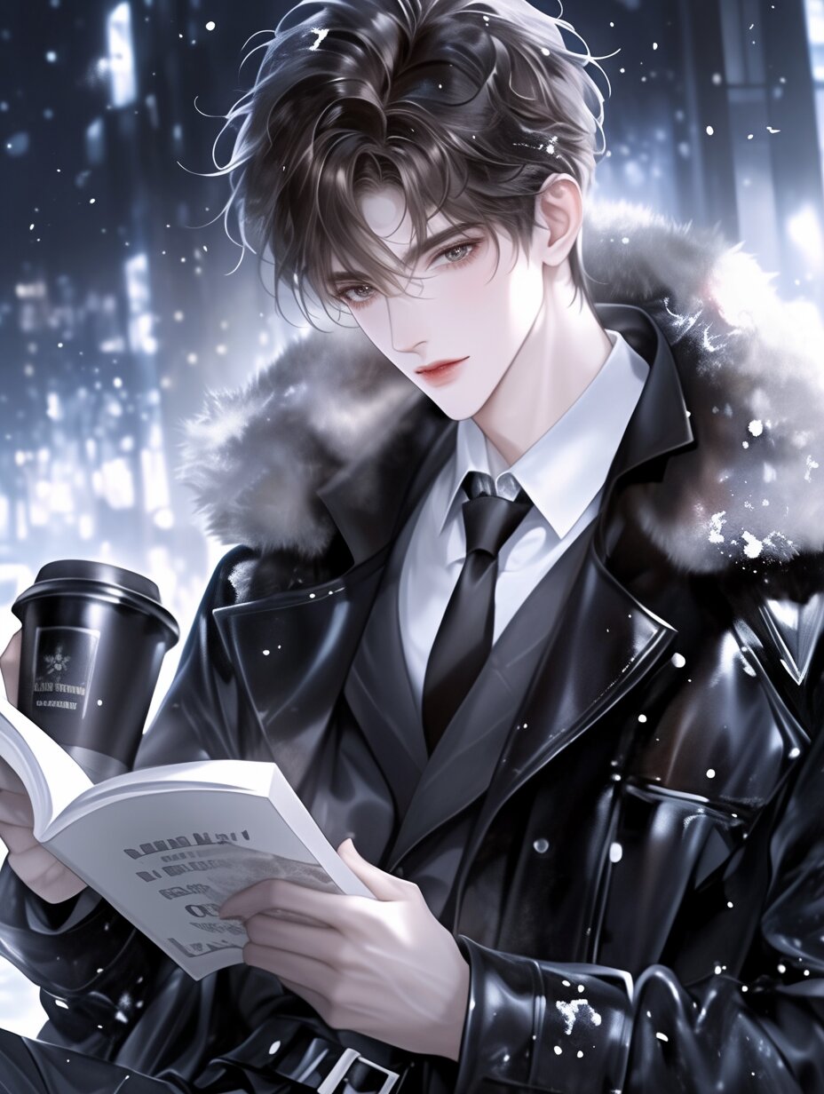 A handsome young man wearing a leather coat trimmed with gray fur, short straight black hair, a black suit, a white collared shirt, a black tie, and black slacks, reading a book under the snow while holding a coffee.