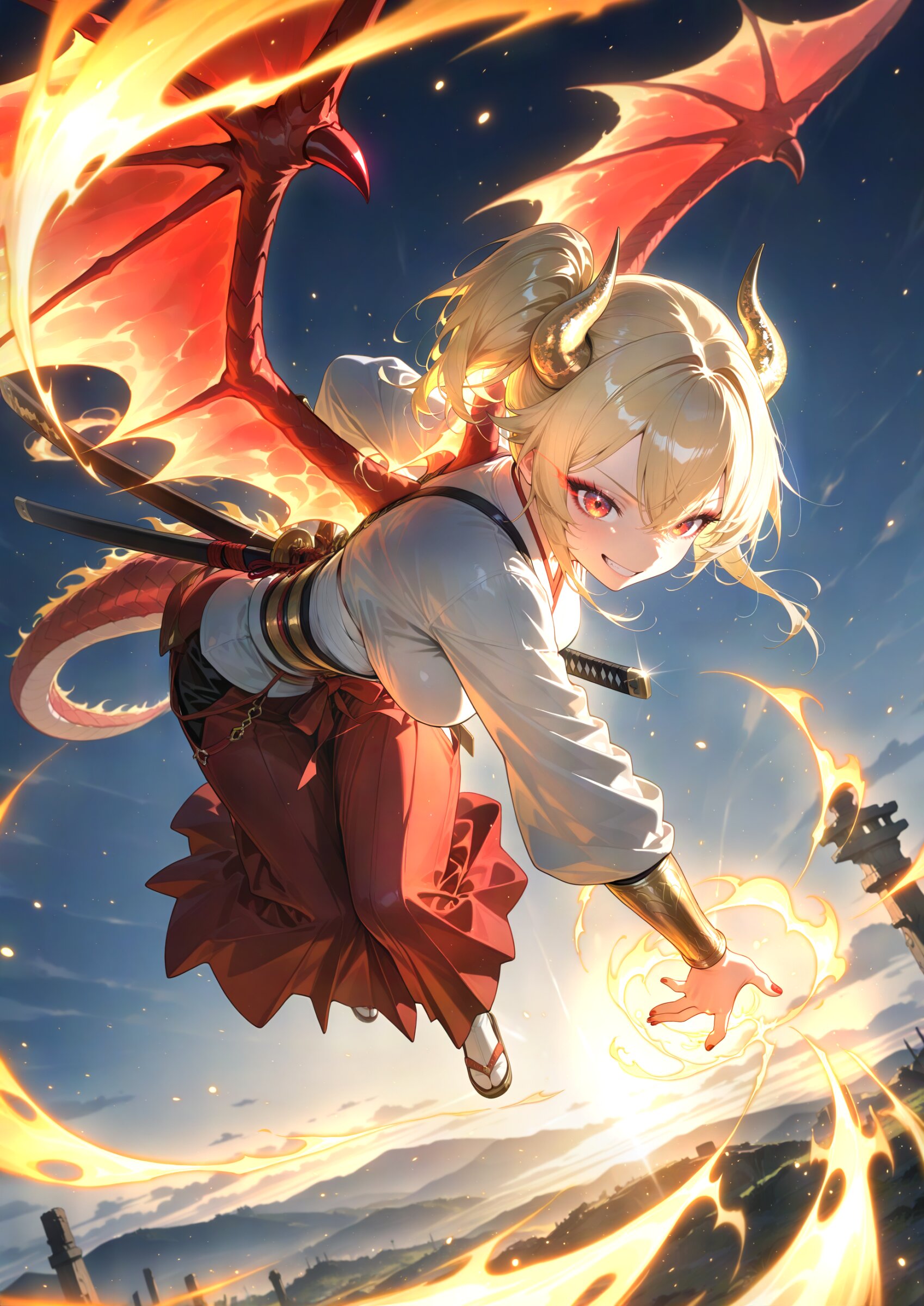 (fisheye,fisheye lens angle:1.0), (aerial view:1.1) medieval japanese fantasy world, A place steeped in British legends, featuring a beautiful hill and ruins., sumi-e, faux traditional media, color ink \(medium\), painting \(medium\), calligraphy brush (medium), monochrome, spot color, 1dragon girl, solo, dragon girl, 18yo, (2dragon gold horns attached to the head:1.2), (blonde hair:1.2) medium hair half updo hair up (side ponytail:1.3), red eyes beautiful iridescence eyes, (eyeshadow:1.2), cute, beautiful, (muscle,buff well-built body,ultra-detailed muscle:0.6) , first-rate female bodies perfect body framed breasts smart hips Average height, red nail polish, a dragon tail (2long red dragon wings on back:1.2), (red hakama:1.0) (overskirt:1.0) (White Japanese Clothes:1.0), sarashi inner, (White long sleeve:1.0) gold and white stripe obi, bracer, straw sandals, tabi, (shiny smile), clenched teeth, eye trail,, glowing japanese sword, (japanese sword action:1.0), swing back katana glint, bent over thumbs up, (swirling red energy,energy magic,energy:1.2), glowing eastern dragon red aura, (swirling black ink effects:1.2) jumping, midair, flexing, black motion blur, An illustration with line art drawn using a brush, featuring dynamic movement lines expressed with thick sumi ink strokes. super fine concept art, unreal engine, graceful eyes, masterpiece, best quality, amazing quality, very aesthetic, absurdres, newest, professional art lots of details, , overexposure, sumie effect style, 4ur4_illu,shiny, glowing, glowing particles, glowing light particles, light particles, light particles, <lora:noline (1):-0.5> <lora:sdxl2-flat2-512b:0.0> <lora:facelightup_xl_v10:0.5> <lora:V2_yakumo_alchemy:0.5> <lora:Aura_illu:0.1>
