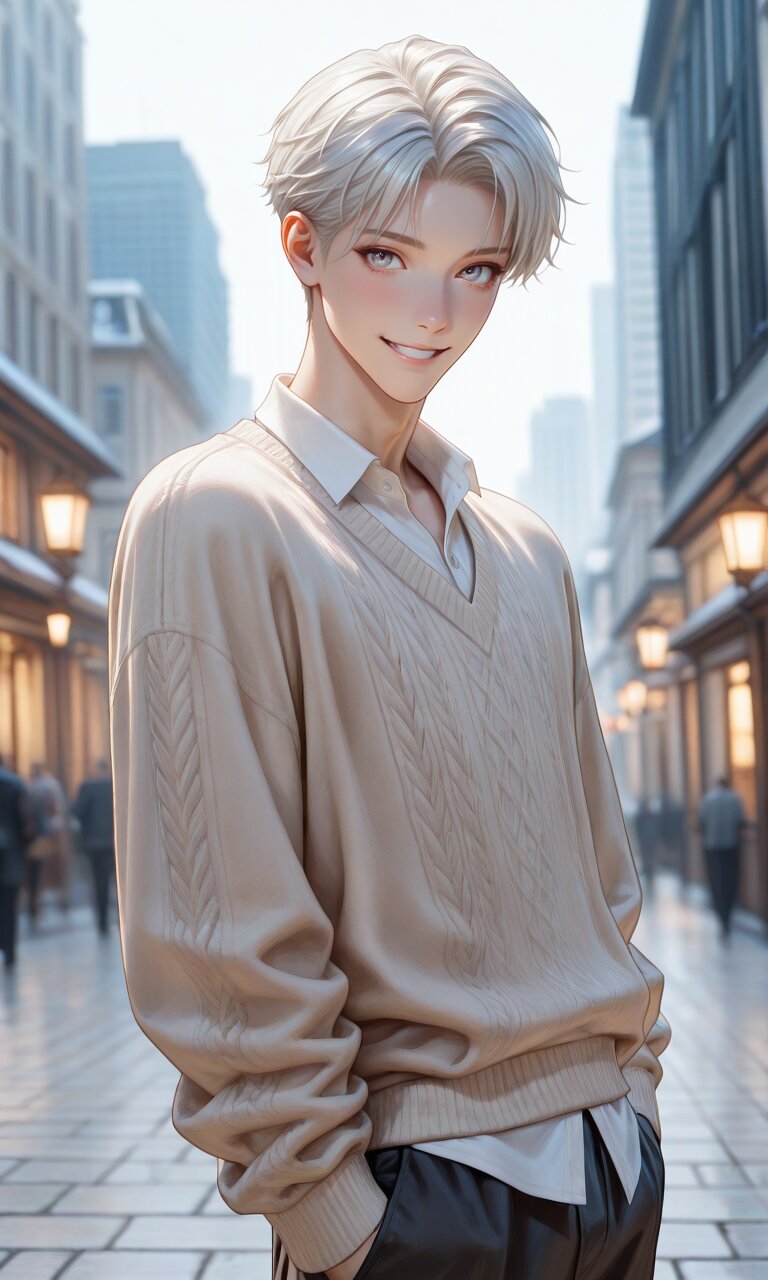 1boy, A breathtakingly handsome young man with silver-white short hair, slightly tousled hair, styled in a soft, layered cut that falls naturally over his forehead, partially covering his sharp, captivating eyes. His intense, light gray eyes exude a mysterious and alluring aura, framed by long, elegant eyelashes. His delicate yet masculine facial features include a straight, well-defined nose, thin lips, and a refined jawline, giving him an otherworldly charm. His expression is subtly melancholic, with a hint of confidence, making him appear both distant and irresistibly attractive. His pale, flawless skin contrasts beautifully against his dark clothing, enhancing the ethereal yet modern aesthetic. cowboy shot, low angle, from side, gaze at viewer. male knit-sweater (The background is the cityscape at the beginning of winter). close-up eyes, smile, dress shirt,, masterpiece, amazing quality, very aesthetic, high resolution, ultra-detailed, absolute, newest, 2d, semi-realistic, moe heroine, sharp focus,, anime style, anime color,, <lora:elf-san_alpha1(AnimagineV31):0.7> <lora:elf-san_alpha4(IL1.0):0.7>