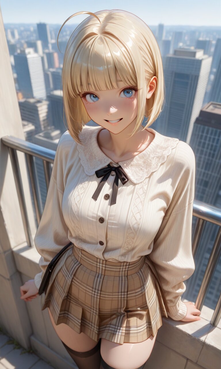 ahoge,blonde hair,blunt bangs,straight hair,short hair,hime cut,delicate face,detailed face,detailed skin,insanely detailed,beautiful,16k. cowboy shot, high angle, from front, side, gaze at viewer. (The background is the cityscape at the beginning of winter). close-up eyes, smile, BREAK (winter outfit, a wool tartan pattern male blouse, beige mini skirt, thigh high socks), sfw:1.2, masterpiece, amazing quality, very aesthetic, high resolution, ultra-detailed, absolute, newest, 2d, semi-realistic, moe heroine, sharp focus,, anime style, anime color,, <lora:elf-san_alpha1(AnimagineV31):0.7> <lora:elf-san_alpha4(IL1.0):0.7>