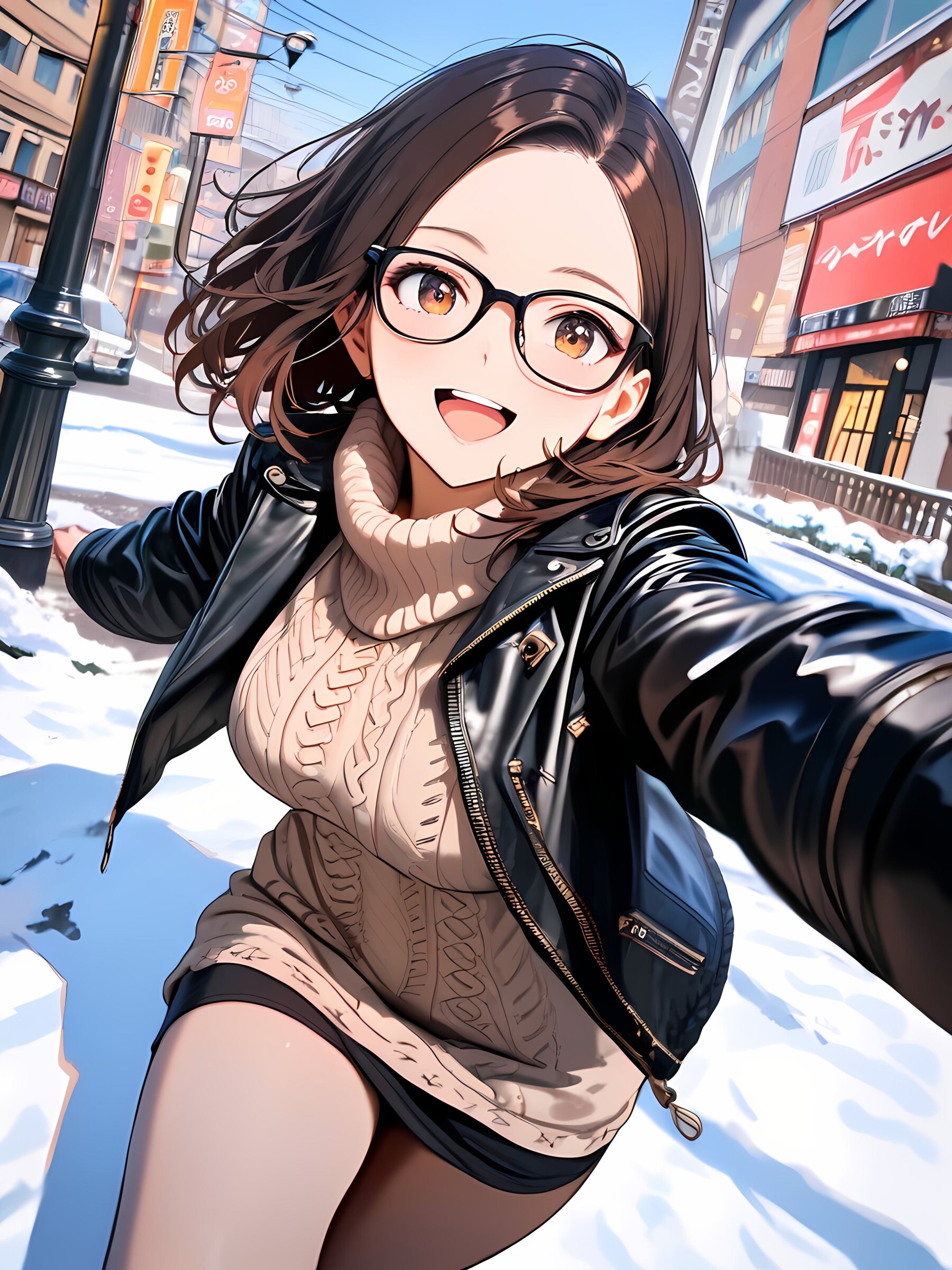 woman, medium hair, brown hair, forehead, glasses, brown eyes, grin, smile, happy, knit, dynamic angle, cowboy shot, city, open mouth, winter, leather jacket