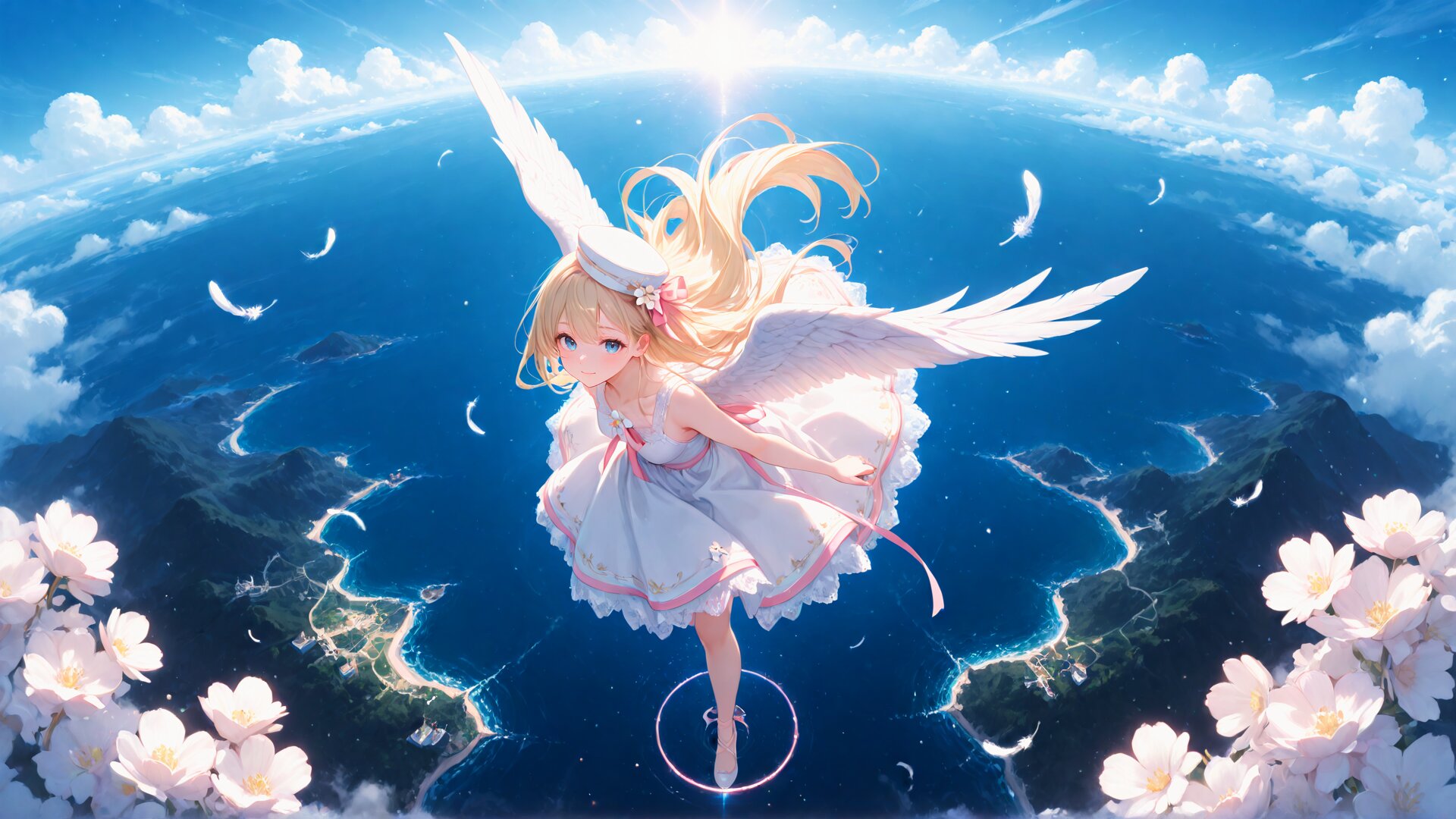 (sea of clouds:0.7),island,blue sky,small island,scenery, 1girl,angel wings,flying,floating hair,feathers, looking at viewer,full body,jumpimg pose, extreme wide shot,long shot, from side,aerial view,vanishing point, BREAK beautiful,beautiful eyes,1girl,20yo,fair_skin,slender,blue eyes,oval face,blonde hair,very long hair,small_breasts,(wings | white wings:1.2),white dress,pink ribbon,white flower ornament,lace,white hat,hat pink flower ornament,lace,light smile, BREAK Particles of light,complex,Natural Light,Attention to detail,Movie Scenes,<lora:xl_more_art-full_v1:0.6>,<lora:great_lighting:0.6>,<lora:flat_sdxl:-0.4>,<lora:outline_xl_kohaku_delta_spv5x:-0.4>,<lora:Detailer_NoobAI_Incrs_v1:0.8>,detailed,, appropriate posture,appropriate configuration,ideal ratio body proportions,perfect anatomy, <lora:Fixhands_anime_bdsqlsz_V1:1>, masterpiece,best quality,newest,absurdres,highres,ultra high res,8K UHD,hyper-detailed,