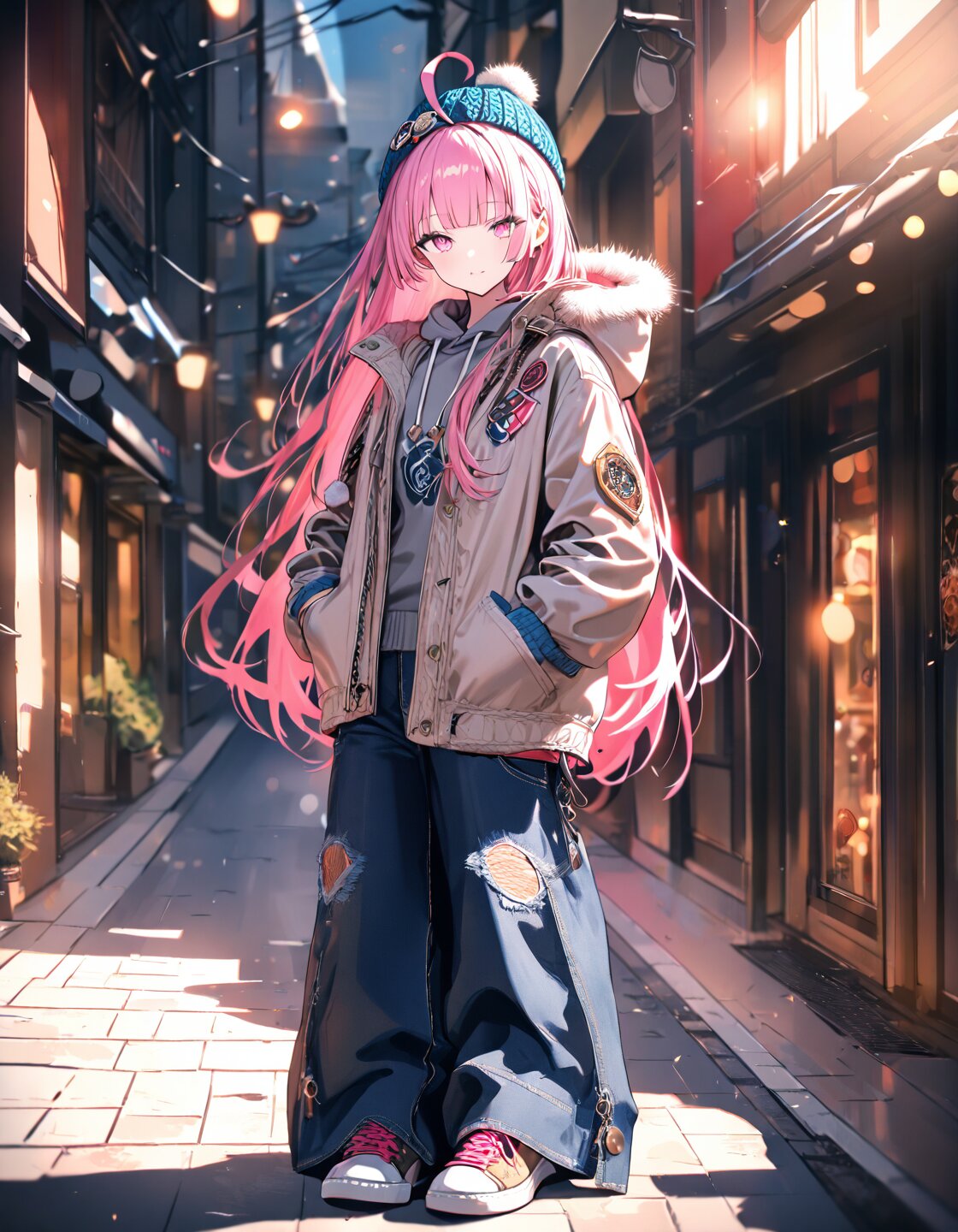 solo,pink hair,ahoge,short hair,straight hair,hime cut,blunt bangs,pink eyes,delicate face,detailed face,detailed skin,detailed clothes,masterpiece,best quality,insanely detailed,beautiful,16k,delightful,hands in pocketwalking,at street,bomber jacket over grey hoodie,knit cap, denim wide leg pants,pierce,in the afternoon,full body shot,sunlights,shining lights,in focus with blurred background,winter fashion,portrait