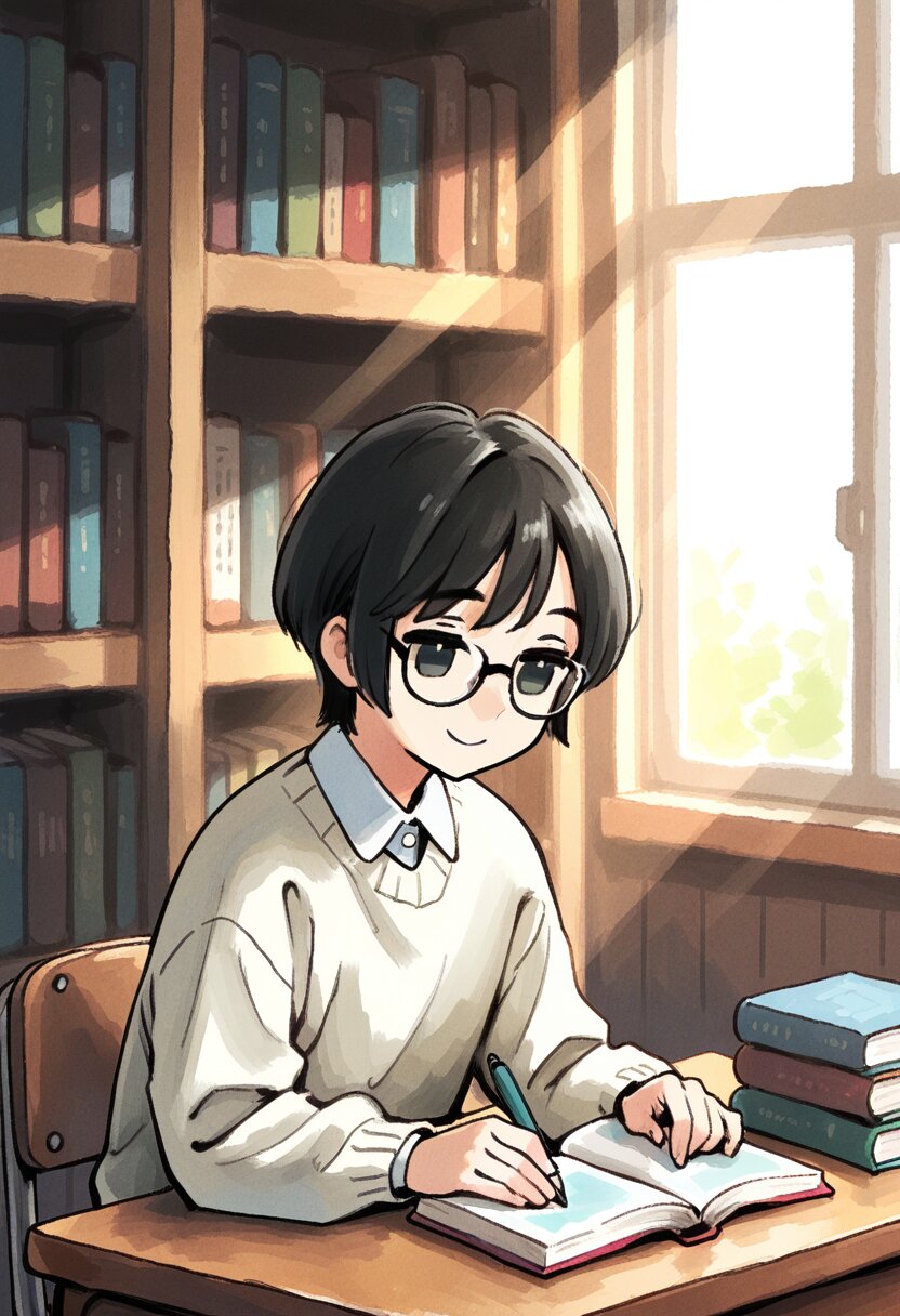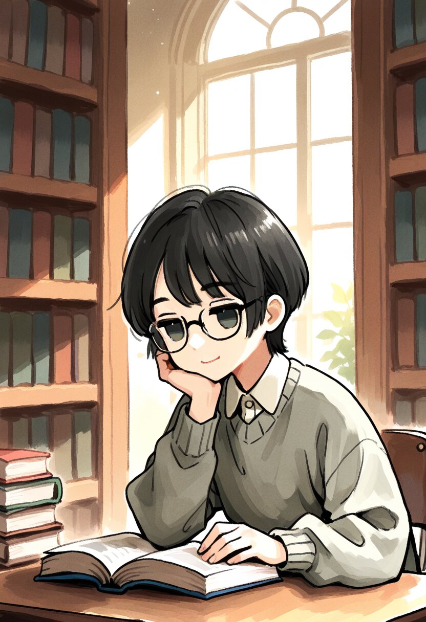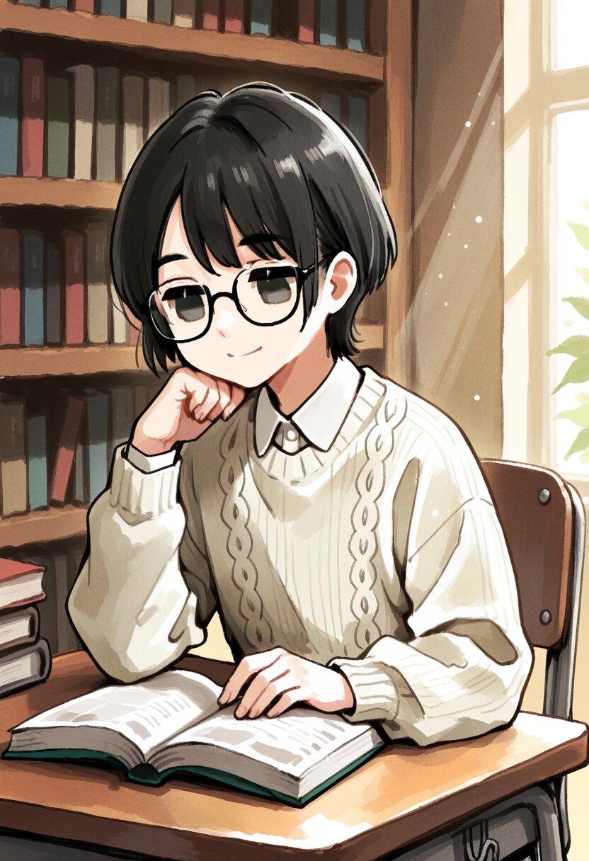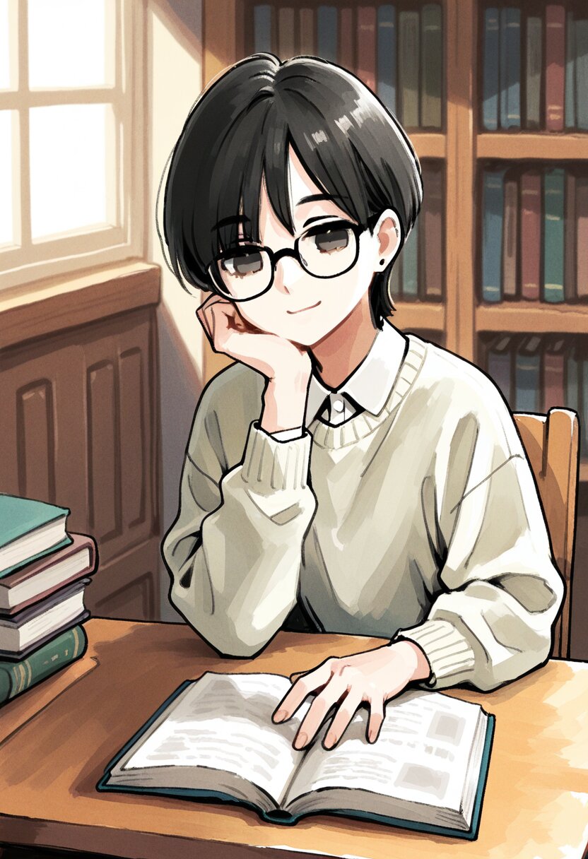 <lora:inmnstyleilxl:0.9>, best quality, masterpiece, very aesthetic, general, watercolor painting, 1male, solo, black hair, short cut, black eyes, ivory sweater, glasses, smile, reading book, desk, library, sunlight