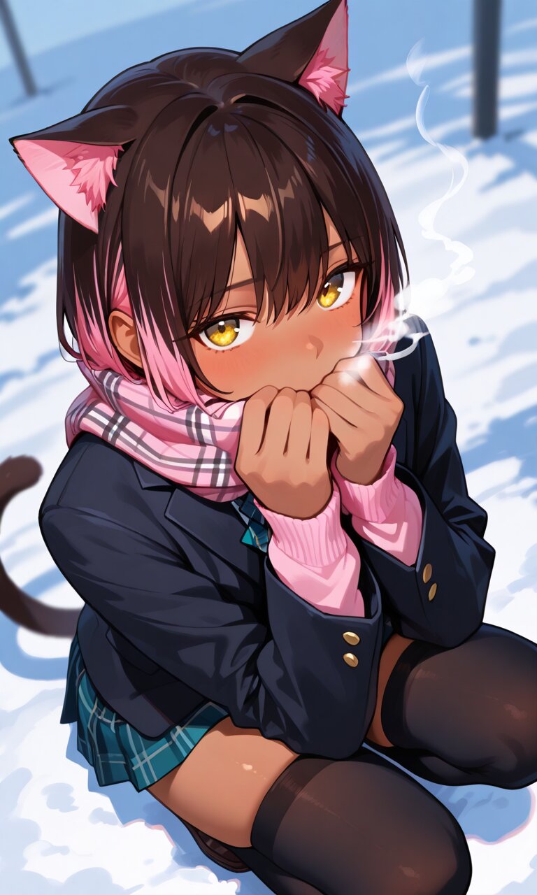 1girl, looking at viewer, depth of field, detailed eyes, dynamic angle, short hair, straight hair, dark brown hair, (pink dip-dye hair:1.3), yellow eyes, cat tail, cat ears, slender, (dark skin:1.2), school_uniform, bow tie, black blazer, pink cardigan, skirt, thighhighs, skindentation, squatting, hands on mouth, smoke, cold, from above, tartan pattern scarf.