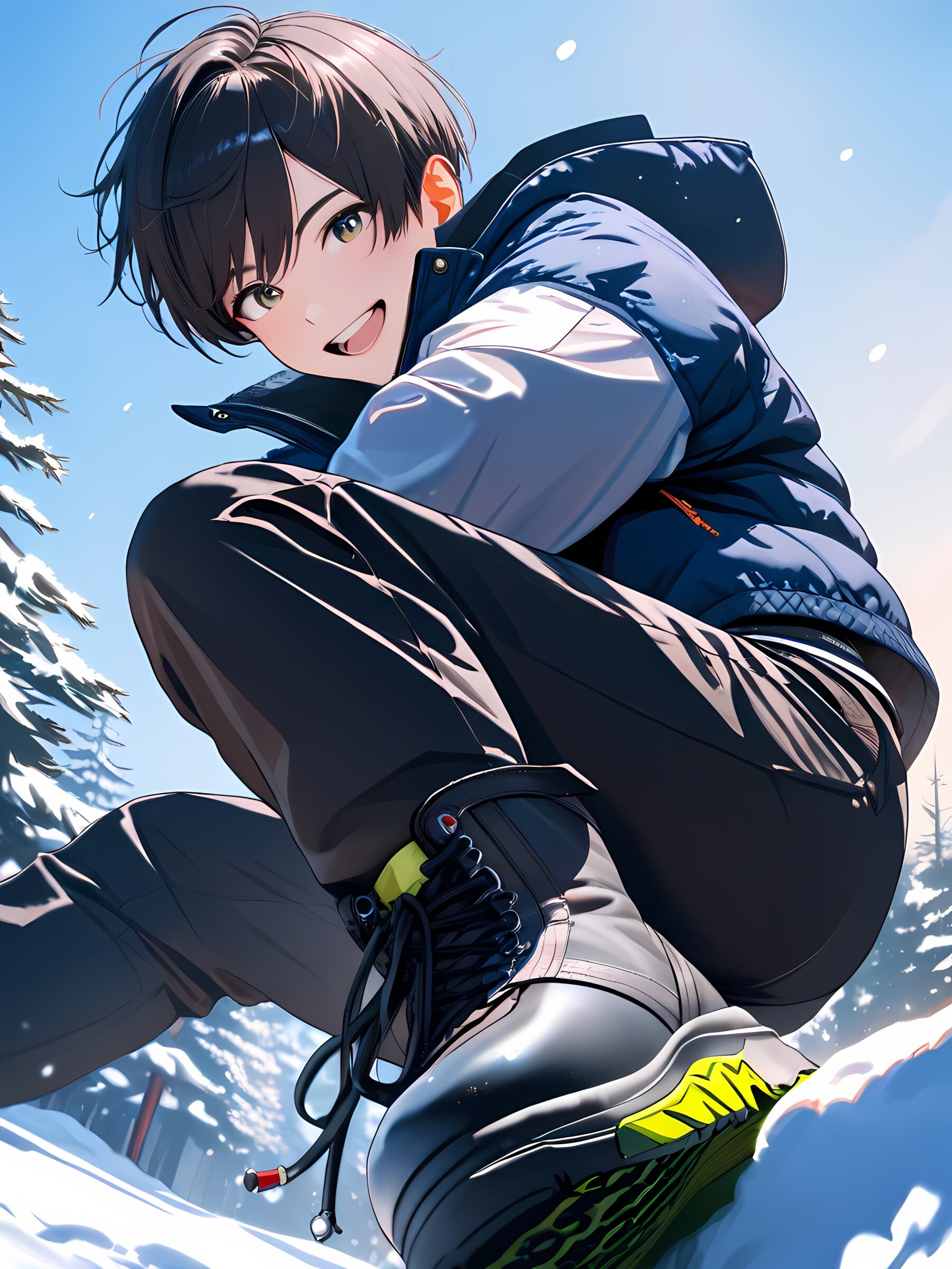 ((solo, male focus, center Snow boots, low angle)), smile, short hair, black hair,
