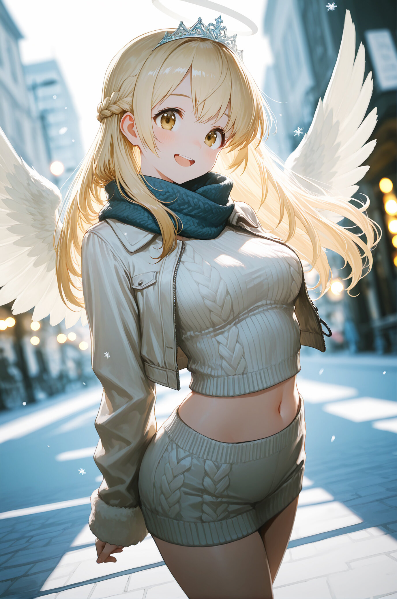 masterpiece, best quality, absurdres, 8k, ultra detailed, aesthetic, very aesthetic, newest, <lora:Fixhands_anime_bdsqlsz_V1:0.5>,<lora:bold-16oa:-0.5>, (realistic:0.3),BREAK (shallow depth of field,Gaussian Blur:1.6),lens flare,1girl,(masterpiece, best quality, ultra-detailed, soft lighting:1.3),(cute anime girl:1.2), (standing pose, cheerful expression,navel:1.2),(wearing fluffy cropped sweater, scarf, short jacket, exposed midriff),(winter city street, twinkling lights, snowflakes falling softly,cinematic composition),blonde hair, long hair, brown eyes, (white angel wings:1.2),tiara,french braid,(happy:1.3),(smile,tareme:1.3),cowboy shot,open mouth,(wide angle,wide shot:1.3),(medium breasts,curvy:1.2),<lora:USNR STYLE_XL_loha:0.8>