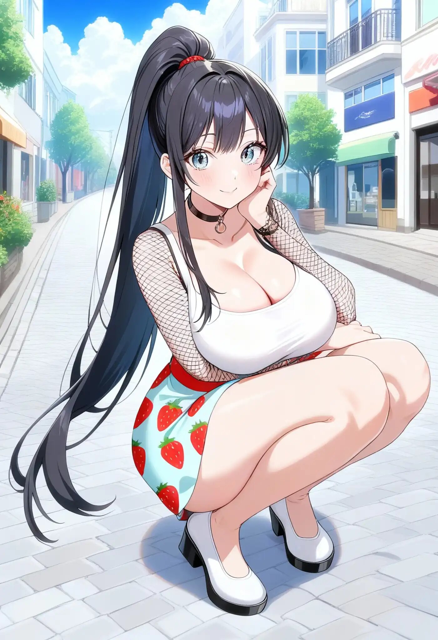 [fishnet sleeves]++, [casual]++, [beautiful girl]++, [huge breasts]++, perky breasts, hanging breasts, curvy, cleavage, collarbone, choker, long sleeves, [Strawberry print skirt]++, bare legs, [full body]++, [Beautiful skin]++, tall, [long hair]++, [straight hair]++, [shiny]++, [shiny skin]++, [shiny clothes]++, [big eyes]++, [shining eyes]++, [Beautiful legs]++, [beautiful face]++, [squatting]++, [panties]++, [hand on own cheek]++, smile, blush, closed mouth, street, outdoors, day, pavement, cloud, sun, [high ponytail]++,