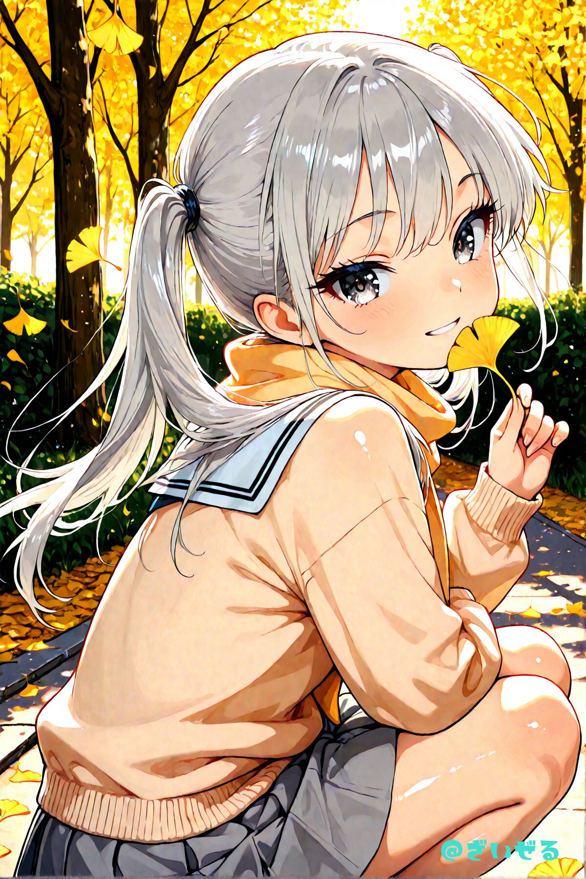 squatting, turning head back, gentle smile, looking at viewer, one hand holding a ginkgo leaf, hair gently blown by wind, light beige knit sweater, white shirt collar visible at neckline, gray pleated skirt, thin pale yellow scarf, soft wool texture, ginkgo-lined path, fallen yellow leaves on ground, soft sunlight filtering through trees, bright white light in distance, golden color palette, gentle wind