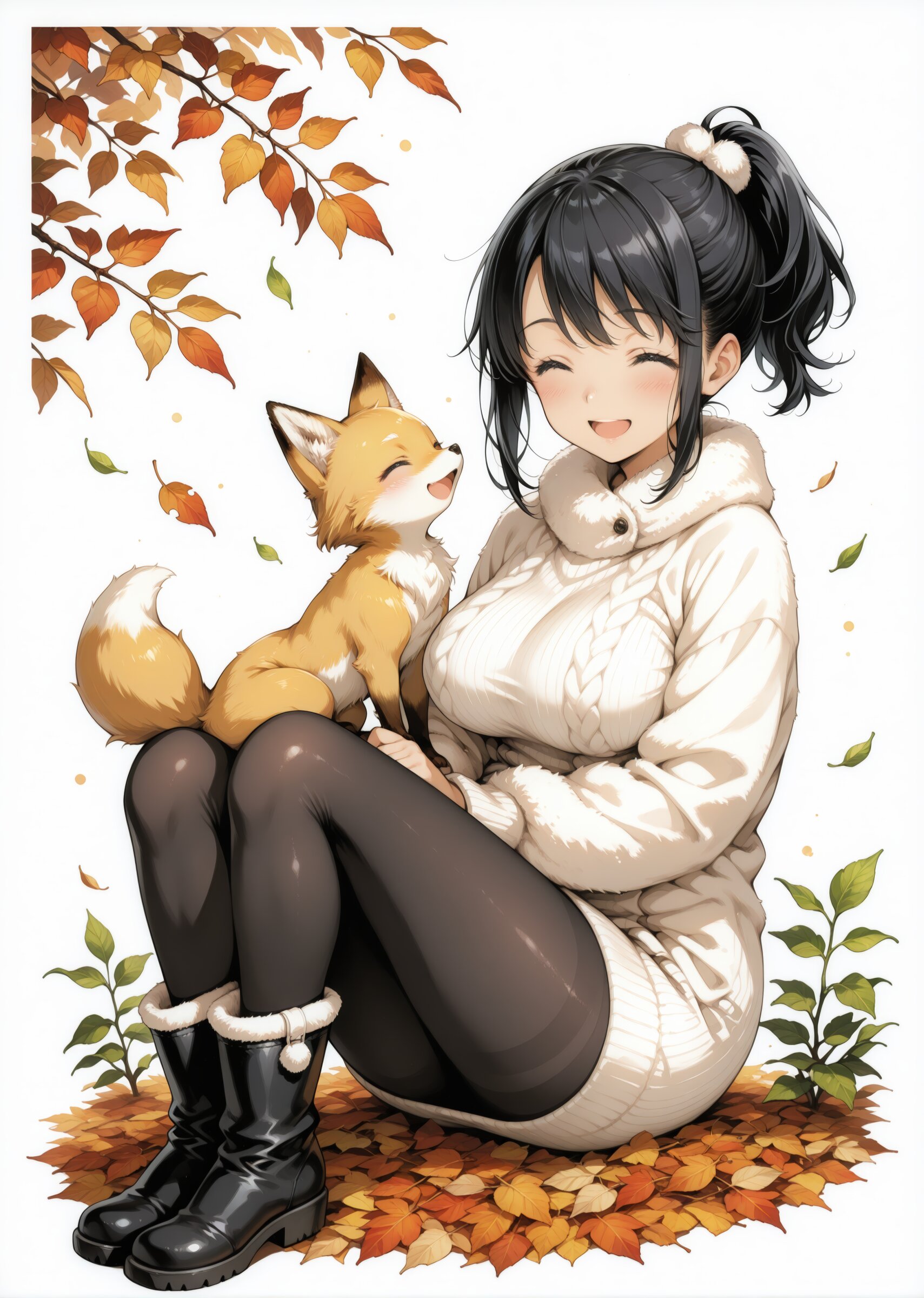 Best quality, Masterpieces, simple background, negative space, anime-style illustration, white background, fine detail, 1girl, (young girl), cute face and eyes, big breasts, black hair, clear black eyes, single short ponytail hair, cute and lovely, Vigorous, lively, and spontaneous personality, Faux fur coat, knitted dress, tights, insulated boots, smile, open mouth, closed eyes, cute small fox cub, happy, Sitting with legs crossed at ankles, botanical background, soft green leaves, minimal natural design, white background, calm atmosphere, Autumn Atmosphere