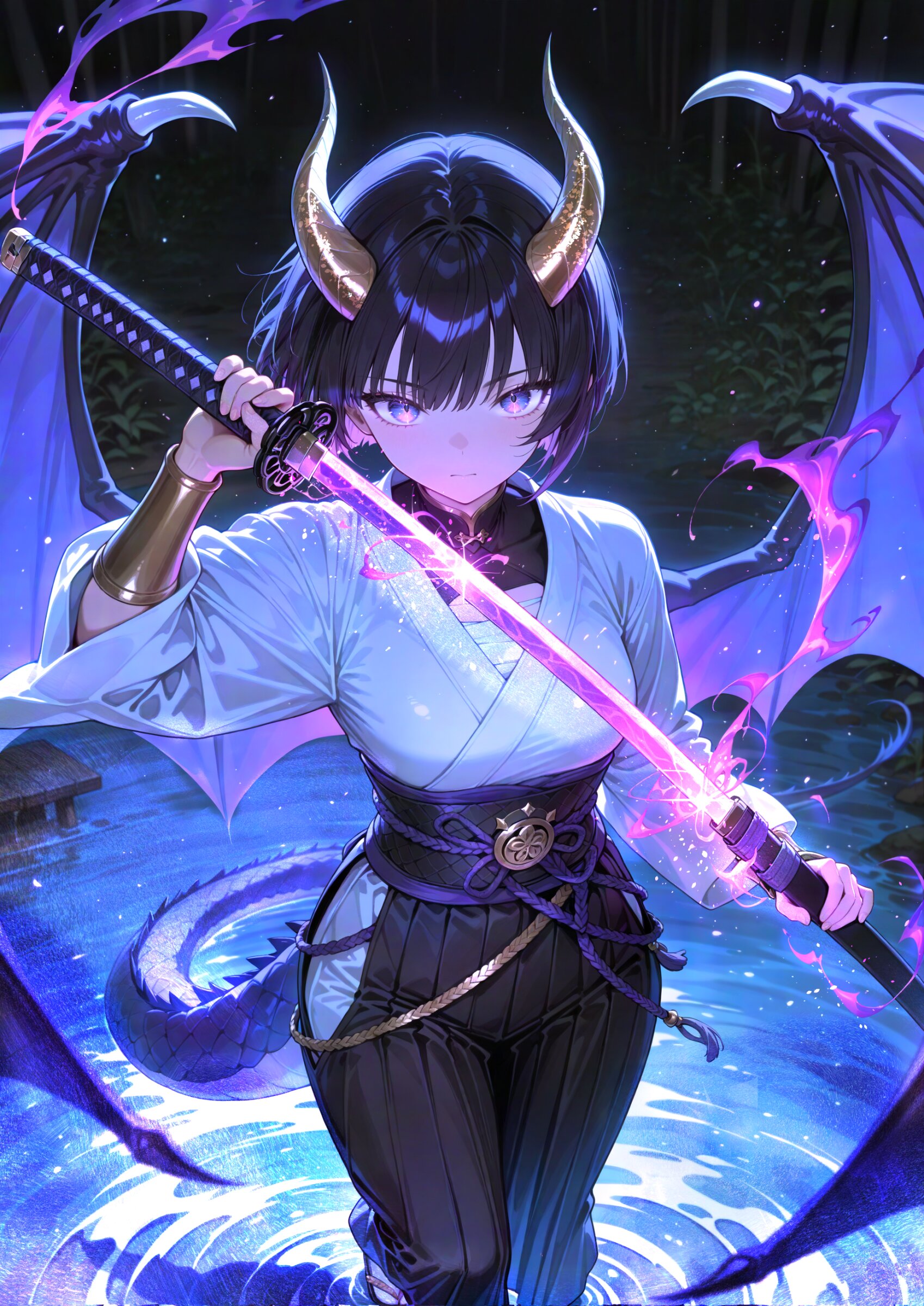 (close up:1.2) (from above,looking up:1.0) In the dim wetlands of a Western fantasy world, a wetland dungeon shrouded in mist unfolds. An old wooden pier, floating on the water surface, serves as a quiet entrance. Inside, dense water plants thrive, and mud pits bubble with eerie bubbles. At the center, ancient artifacts lie submerged, surrounded by strange plants emitting an odd light. This dungeon is a labyrinth filled with danger and secrets, where adventurers may encounter unknown creatures., sumi-e, faux traditional media, color ink \(medium\), painting \(medium\), calligraphy brush (medium), monochrome, spot color, 1dragon girl, solo, , cowboy shot, (blurry foreground:1.0), , dragon girl, 16yo, (2dragon gold horns attached to the head:1.2), (dark purple black hair:1.2) (very short hair:1.0) (bob cut:1.0) (pixie cut:0.4), (violet eyes:1.2) beautiful iridescence eyes, cute, cool, (muscle,buff well-built body,ultra-detailed muscle:0.5) , first-rate female bodies, perfect body medium breasts medium hips cute, a dragon tail (2long black dragon wings on back:1.2), dark brown ankle-length hakama, (overskirt:1.0) White Japanese Clothes, sarashi inner, (White long sleeve:1.0) purple and white stripe obi, bracer, straw sandals, tabi, mysterious face, calm, expressionless, (light smile:0.5), (empty eyes:0.6), , (mysterious smirk:0.0), closed mouth, mysterious atmosphere, glowing japanese short sword, (japanese sword action:1.0), glowing sword katana battoujutsu stance, (ready to draw,scabbard,unsheathing, holding sheath:1.0) glint, (swirling purple energy,energy magic,energy:1.2), glowing eastern dragon purple aura, assassin ninja action, ink wash painting, An illustration with line art drawn using a brush, featuring dynamic movement lines expressed with thick sumi ink strokes. super fine concept art, 8K, graceful eyes, masterpiece, best quality, amazing quality, very aesthetic, absurdres, newest, professional art lots of details, , 以下文字数制限