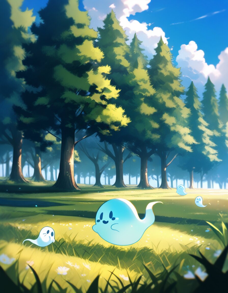 forest, field, depth of field, blue sky, cloud, cute ghost, masterpiece, high quality, absurdres