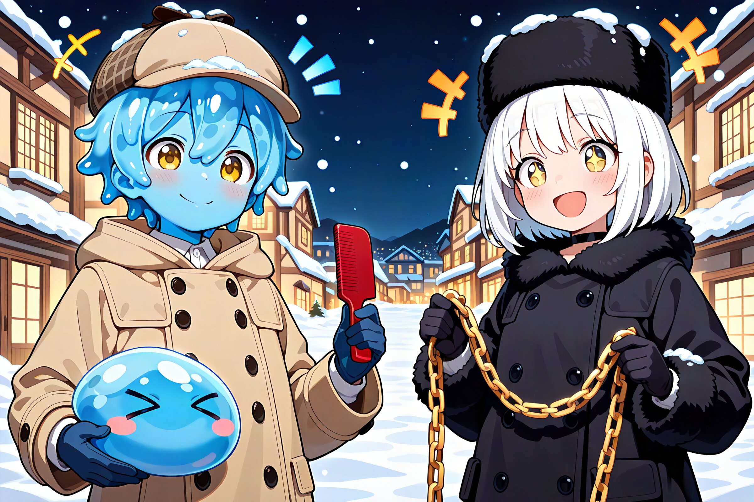 1 little boy, symmetrical pose, masterpiece, best quality, amazing quality, very aesthetic, (blue slime boy:1.2), blue hair, short hair, yellow eyes, (slime skin:1.2), closed mouth, smile, cheerful, +++, notice lines, choker, male winter outfit, gloves, trench coat, deerstalker, holding red comb, slime on headwear, > <, winter, snow, night, town, BREAK 1 little girl, symmetrical pose, masterpiece, best quality, amazing quality, very aesthetic, white hair, short hair, yellow eyes, +_+, open mouth, smile, cheerful, +++, notice lines, choker, black fur coat, black russian fur hat, gloves, holding golden chain, winter, snow, night, town,